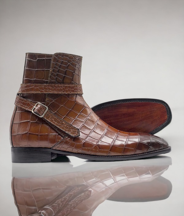 Hanamade Brown Jodhpurs Style Alligator Texture Leather Boots,Men's Ankle High Stylish Boots