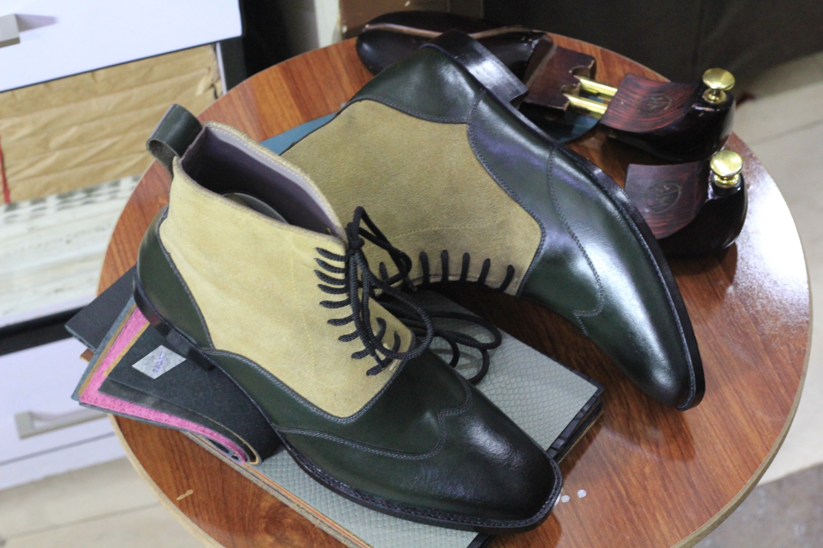 Handmade Beige and Green Colour Leather Suede Lace Up Wing Tip Men's Boots
