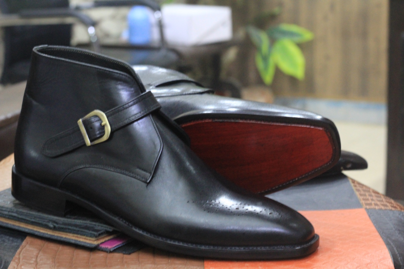 Black Colour Genuine Handmade Leather Single Buckle Brogue Toe Men's Fashion Boots