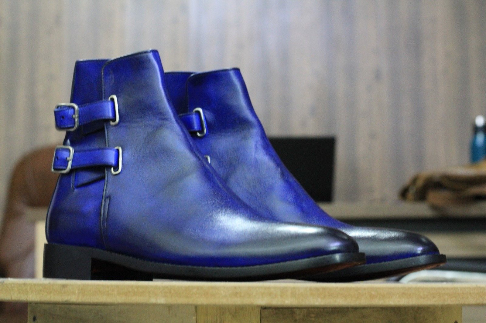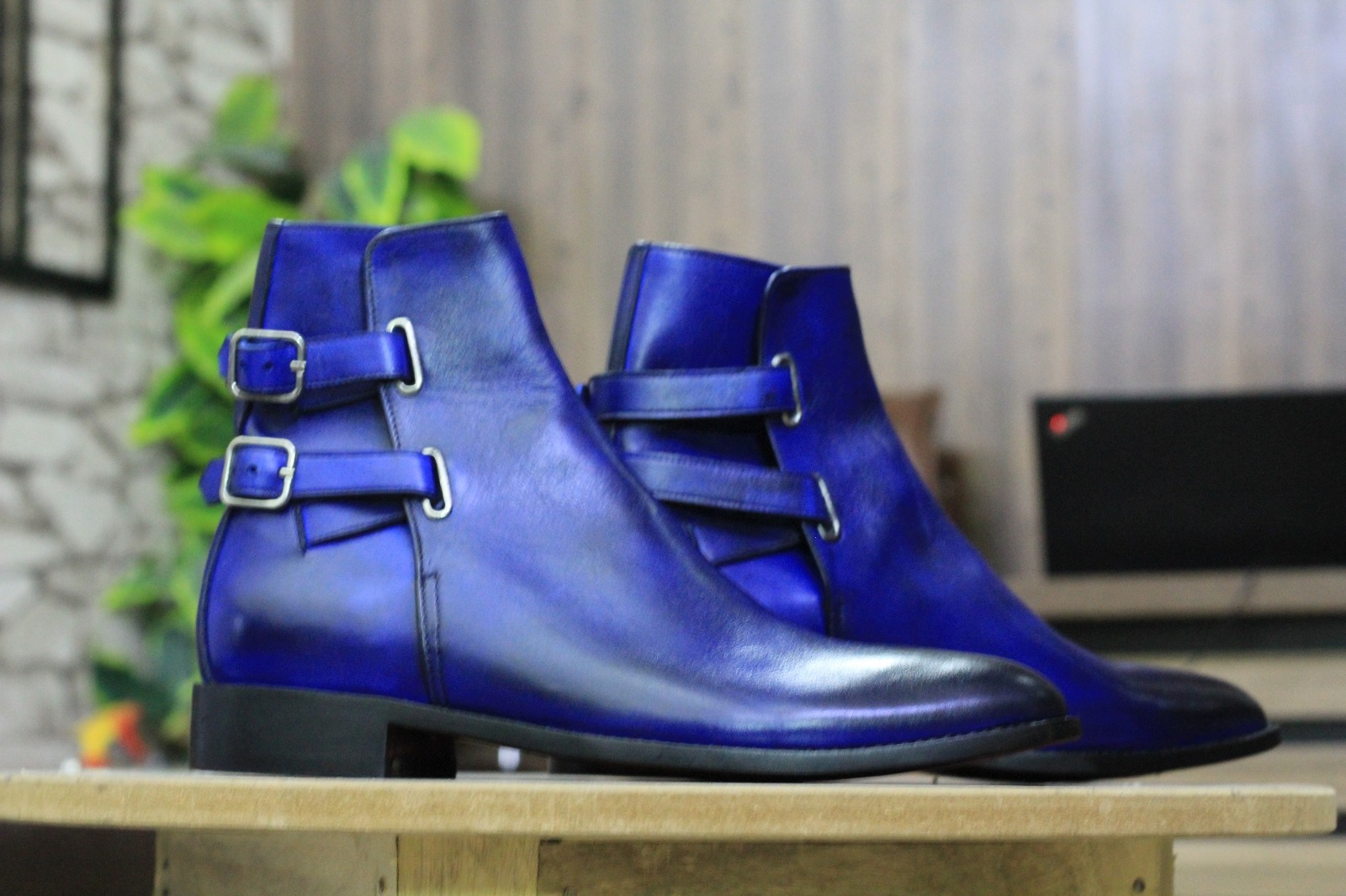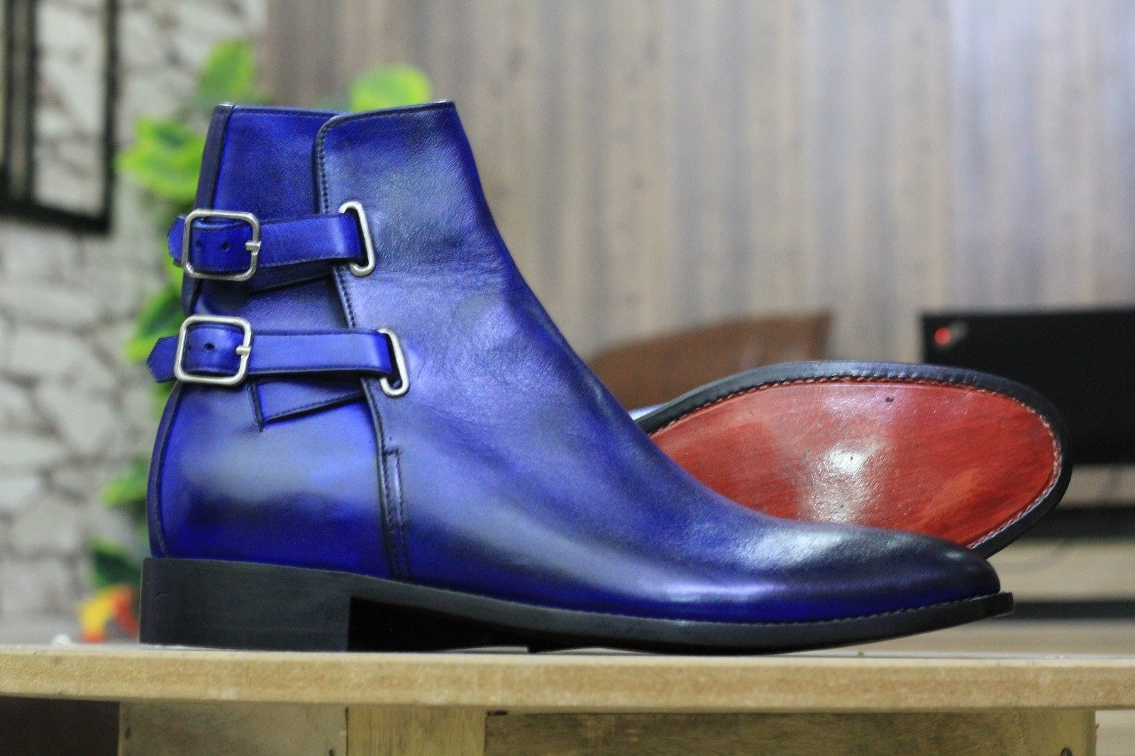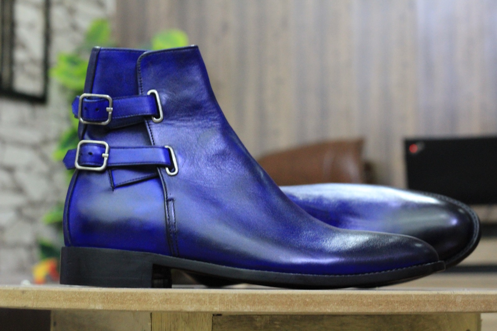 Hanamade Blue Colour Double Buckle Genuine Handmade Leather Ankle High Designer Boots
