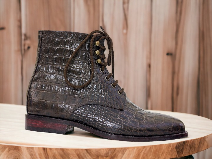 Brown Color Pure Handmade Crocodile Texture Leather Lace Up Style Designer Boots for Men's