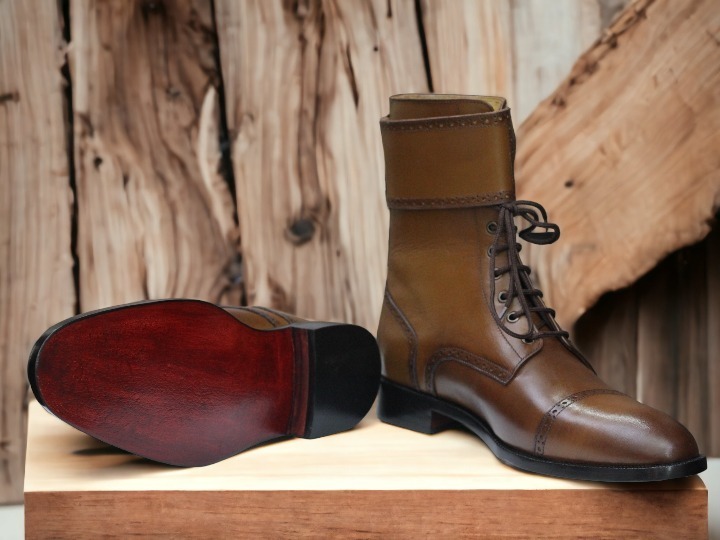 Handmade Men's Double Buckle Cap Toe Ankle High Lace Up Boot, Designer Boot