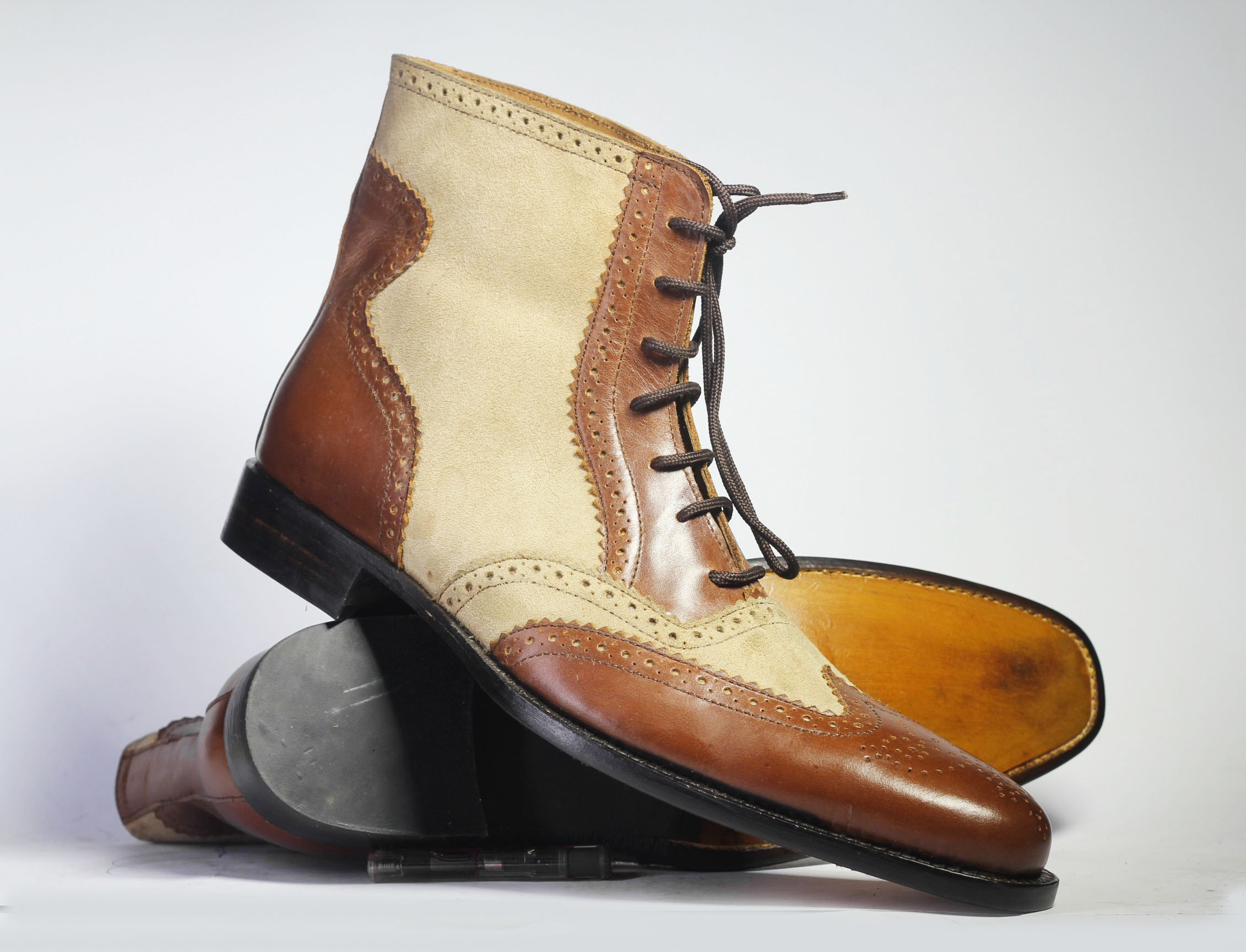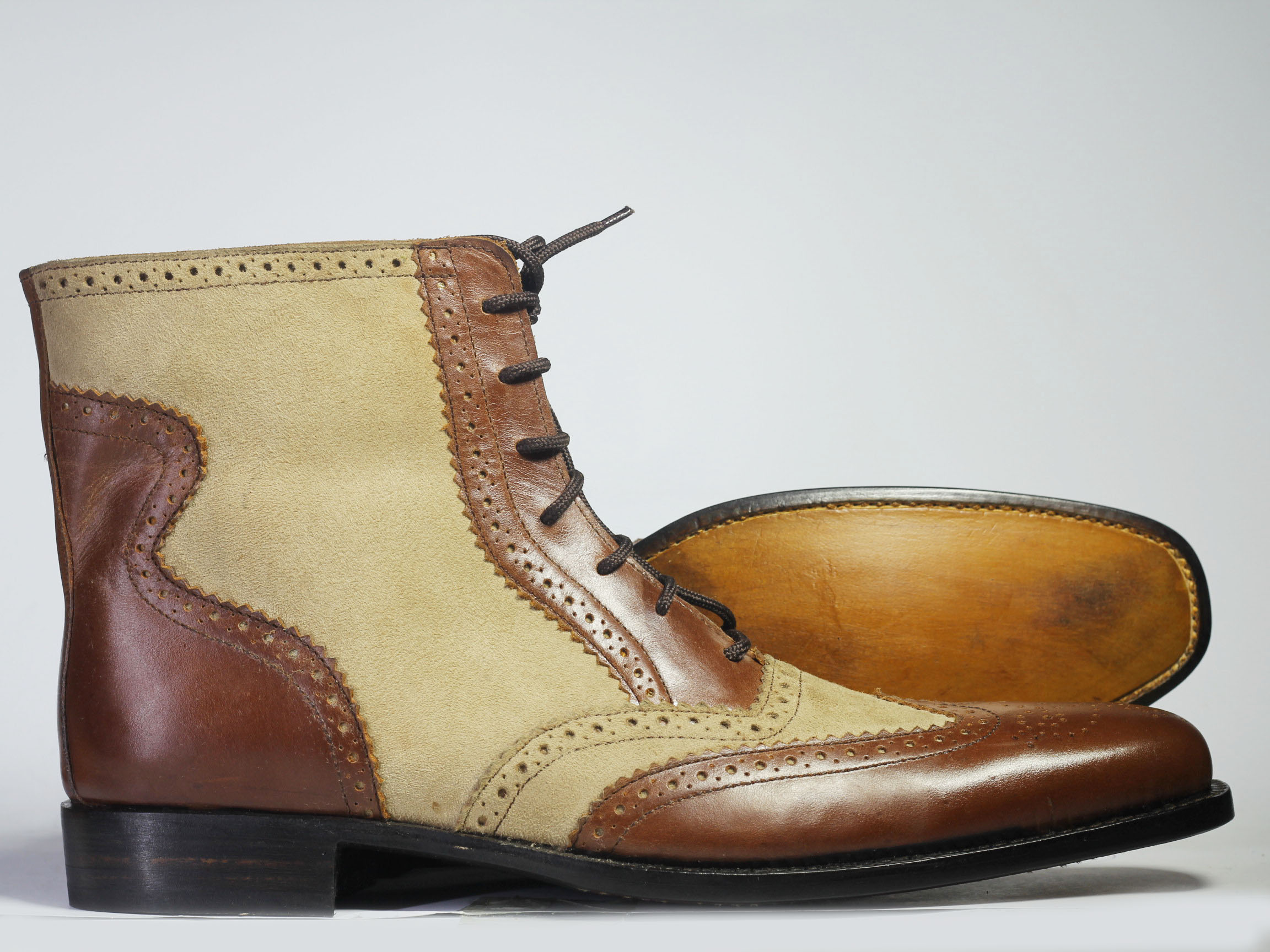 Men's Ankle High Brown Beige Wing Tip Brogue Leather Suede Lace Up Boot
