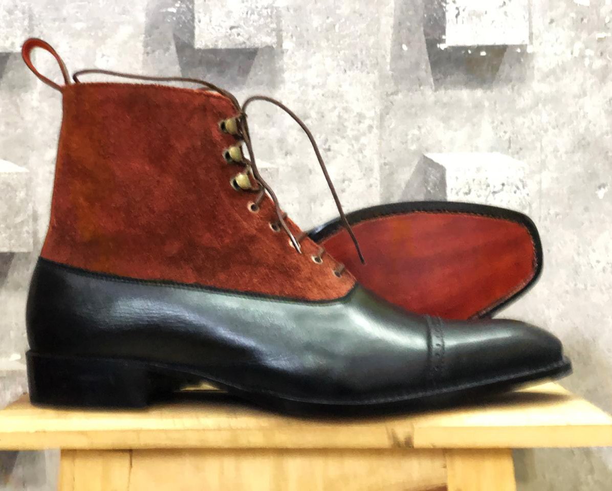 Men's Handmade Brown Black Cap Toe Leather Suede Lace Up Boot