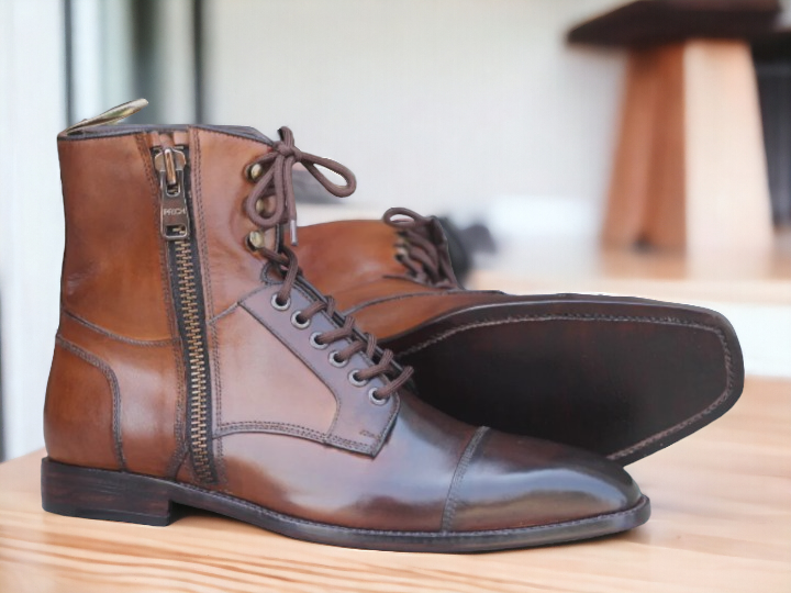 Bespoke Ankle High Black Cap Toe Zipper Boot, Men's Lace Up Boot