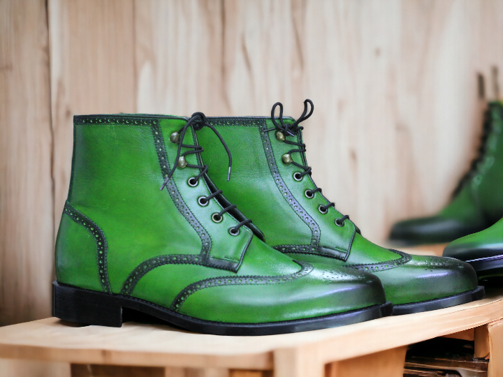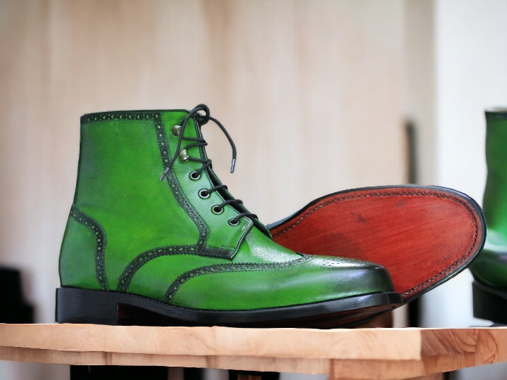 Handmade Ankle High Green Genuine Leather Boot, Men's Formal Boot