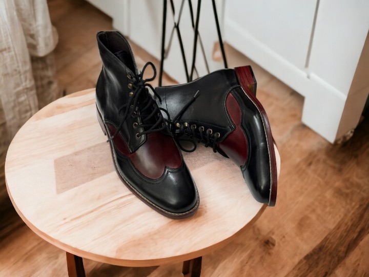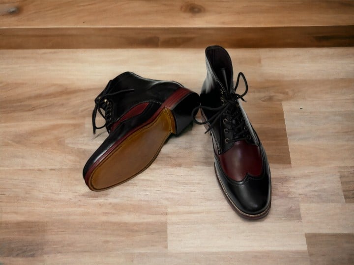 Handmade Ankle High Two Tone Wing Tip Lace Up Leather Boot For Men's