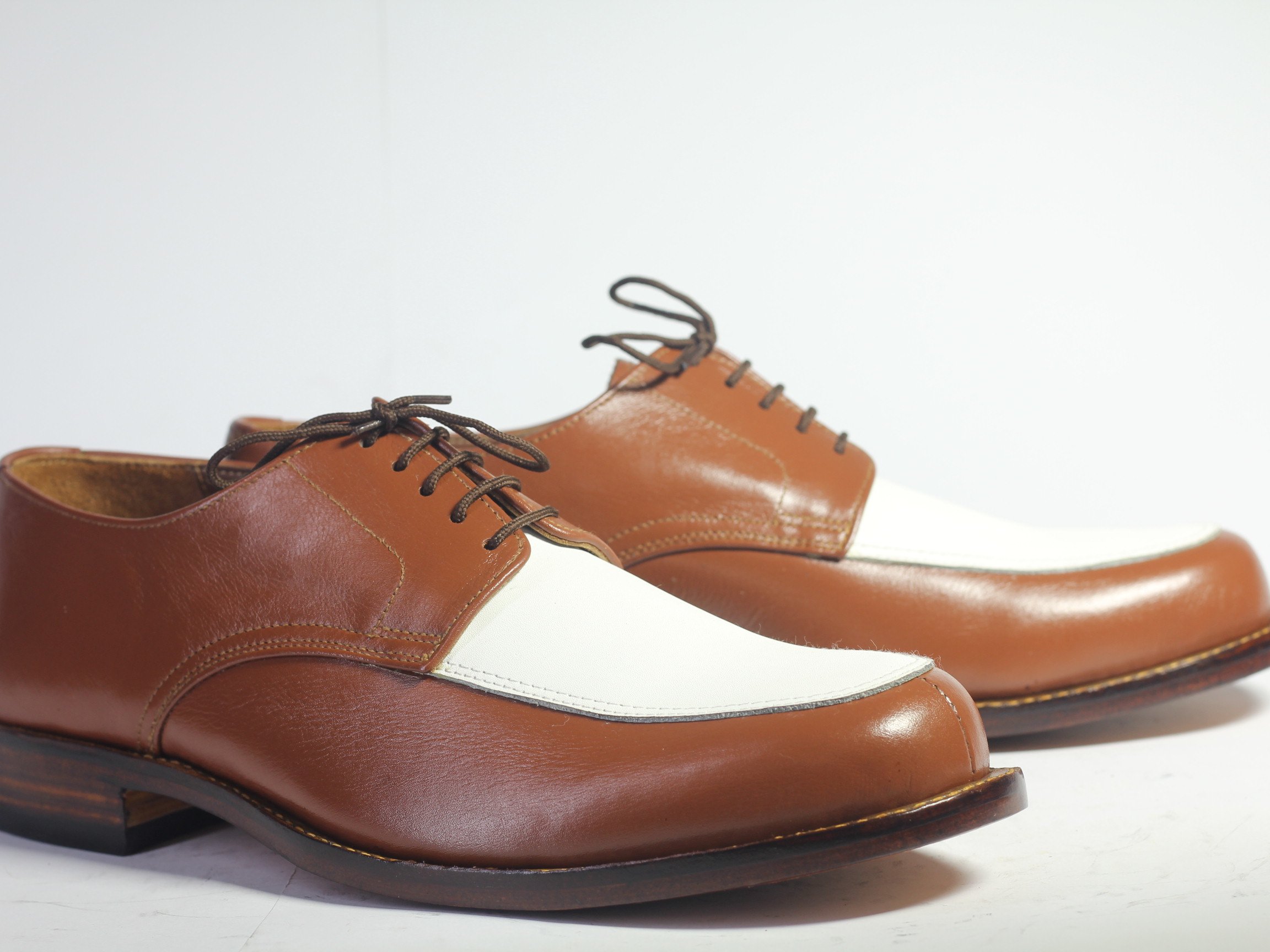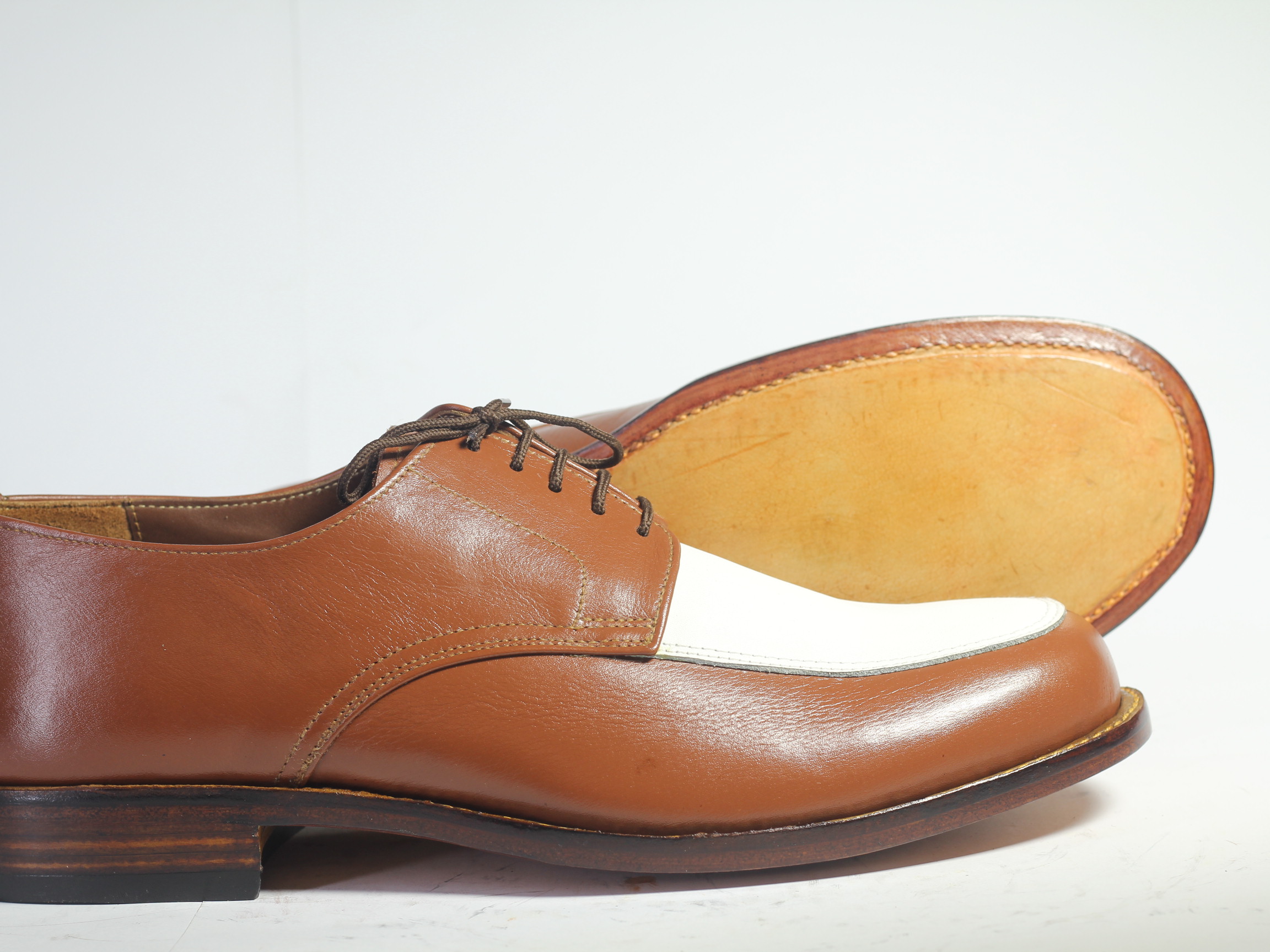 Handmade Men's Brown & White Color Leather Round Toe Dress Formal Lace Up Shoes