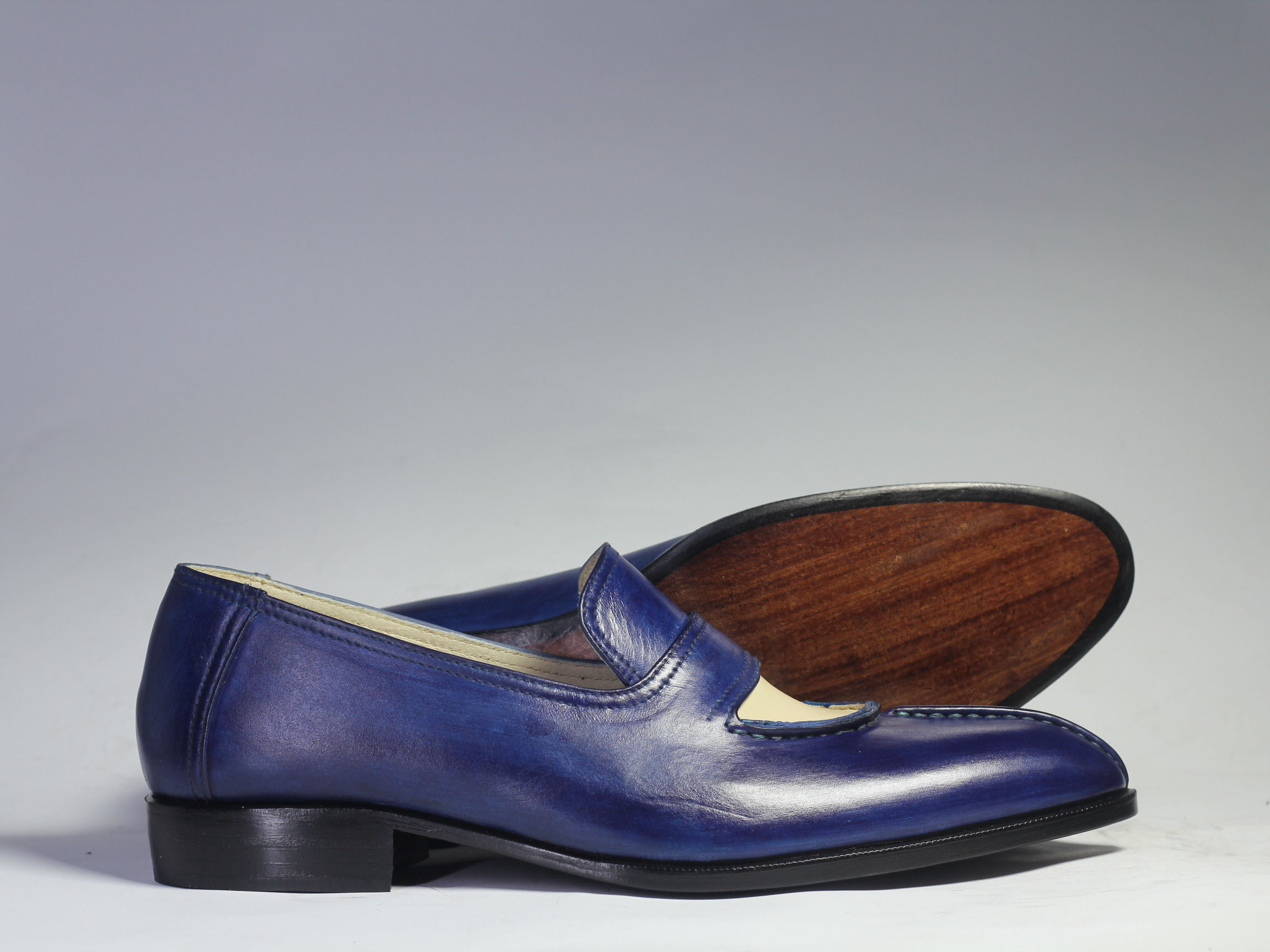 Handmade Men's Blue & white Split Toe Leather Shoes