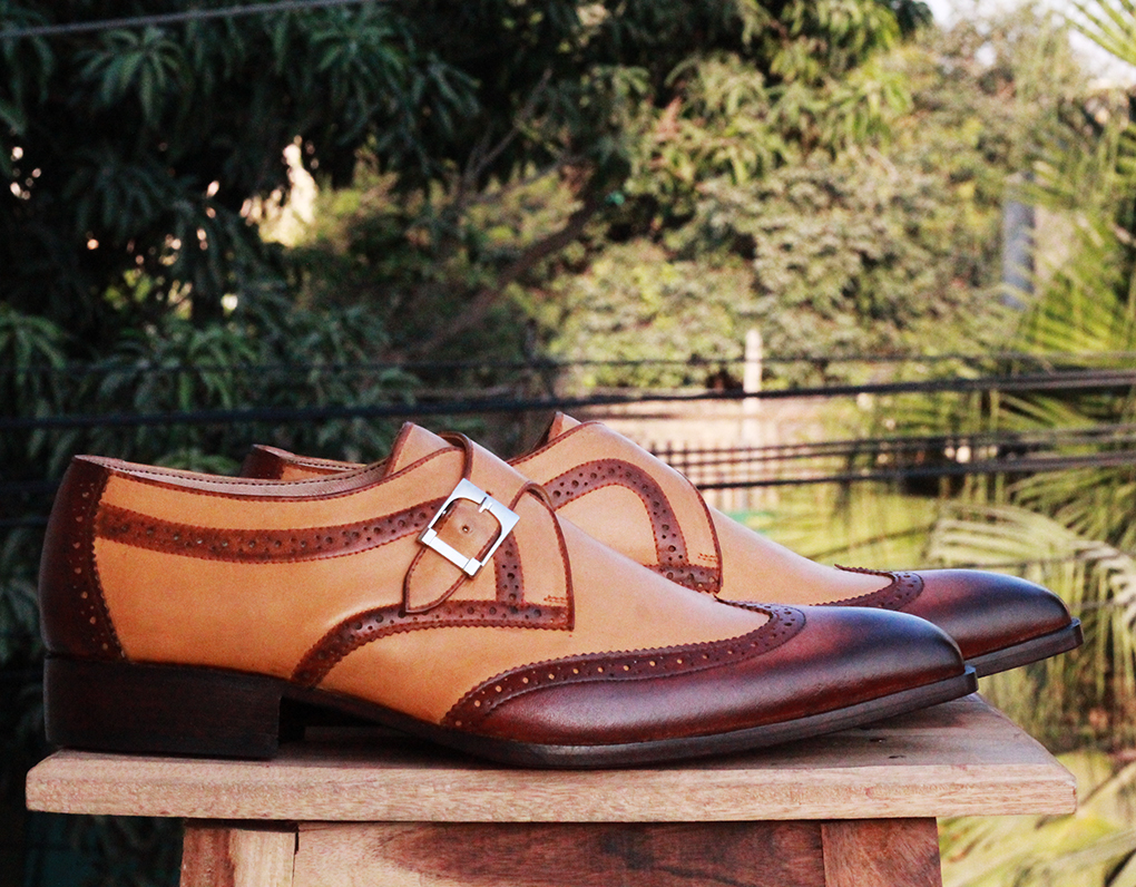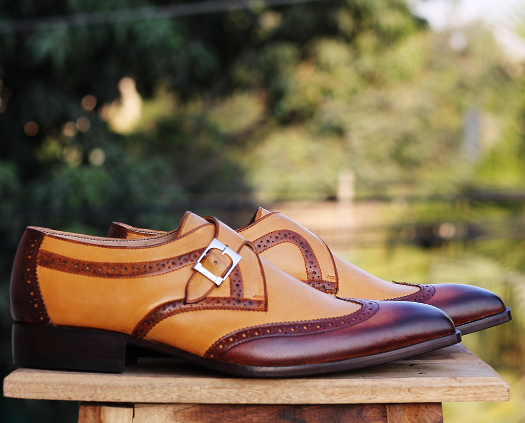 Handmade Men's Tan & Burgundy Monk strep Leather Dress Shoes
