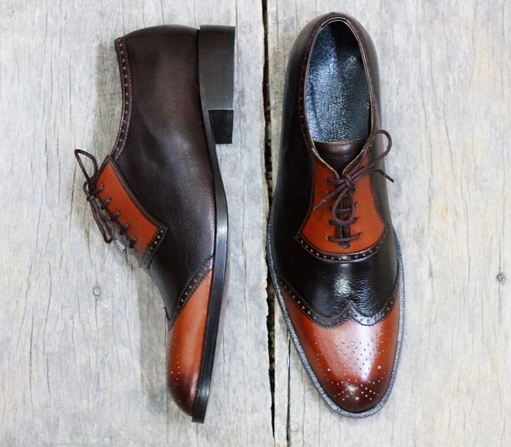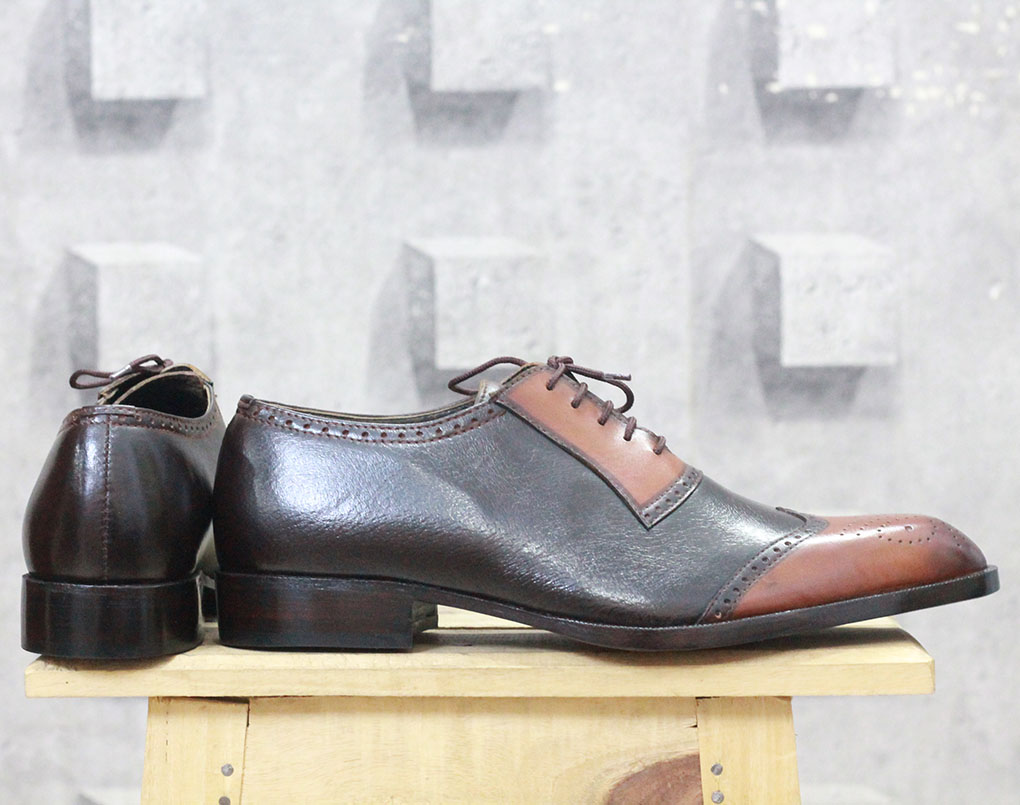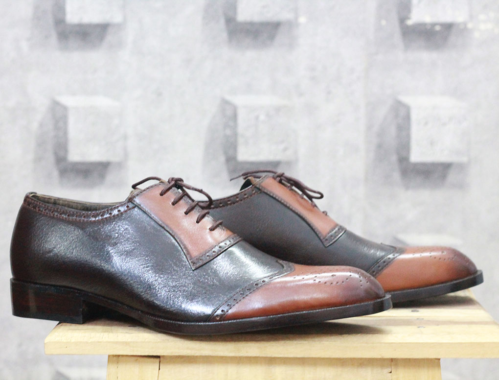Handmade Black & Tan Brogue Leather Lace Up Shoes For Men's