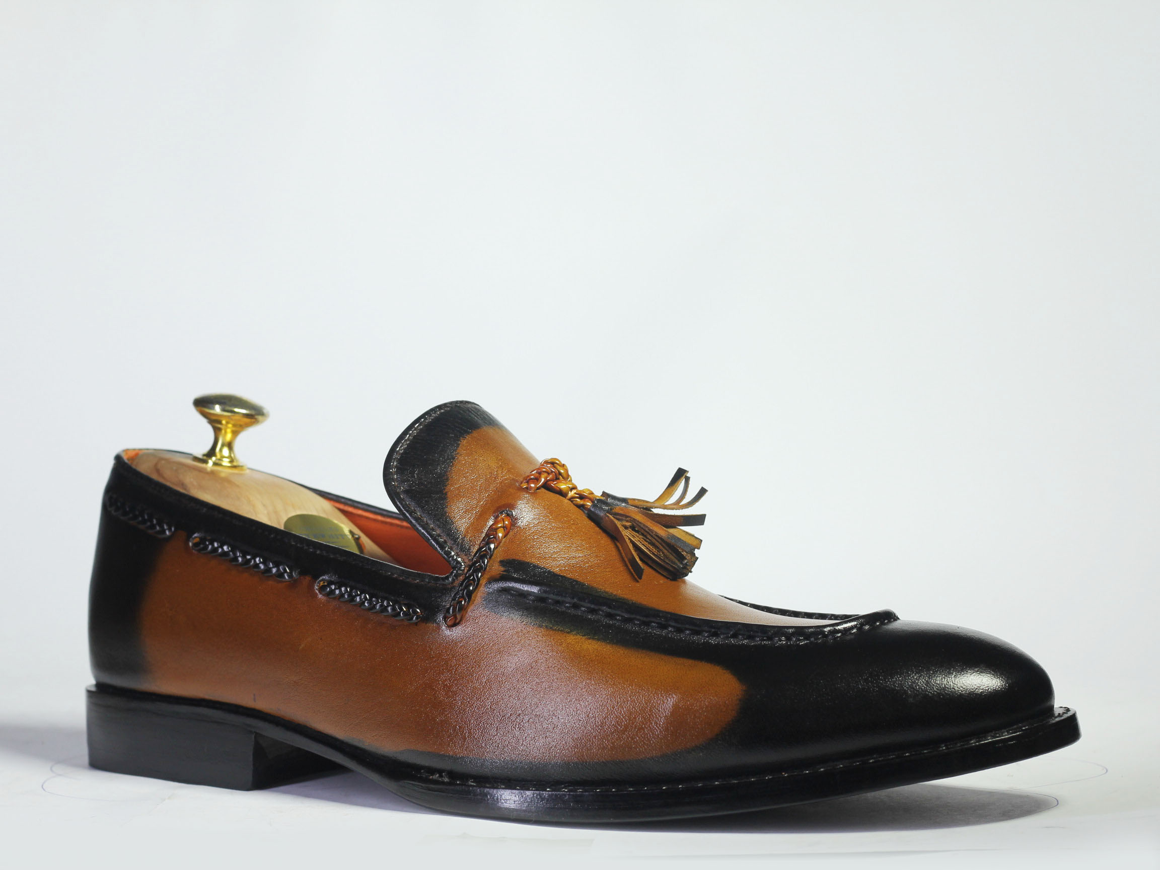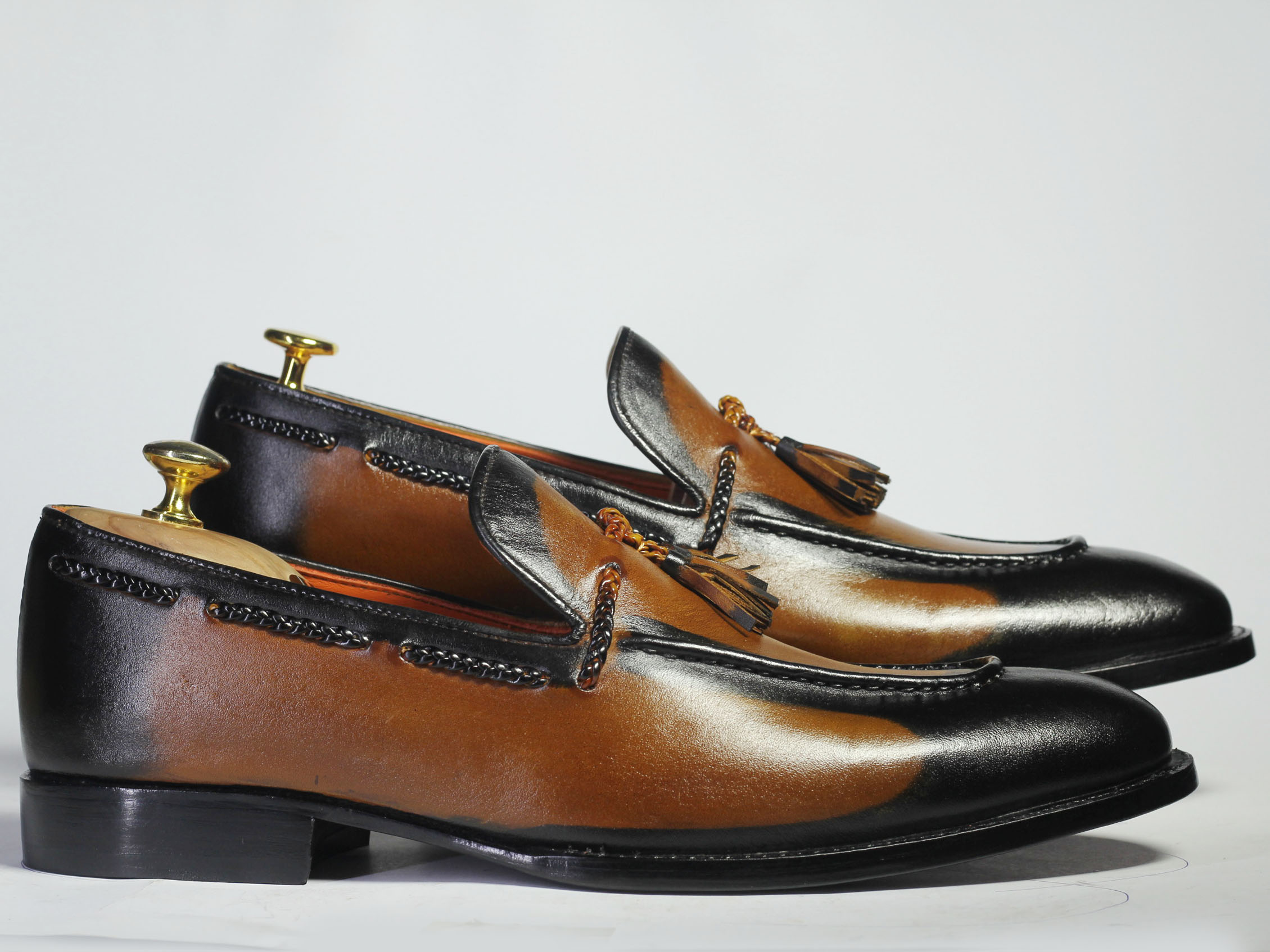 Handmade Black & Brown Tussles Leather Shoes For Men's