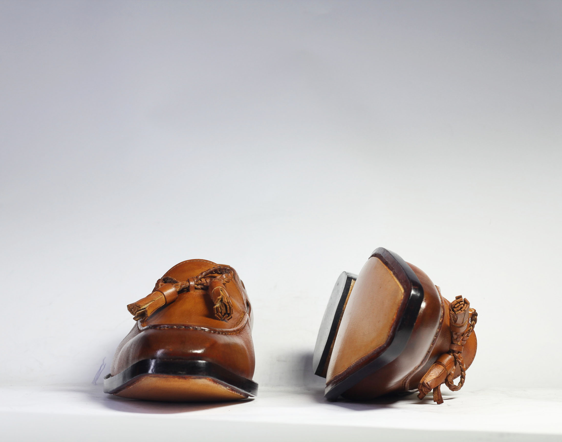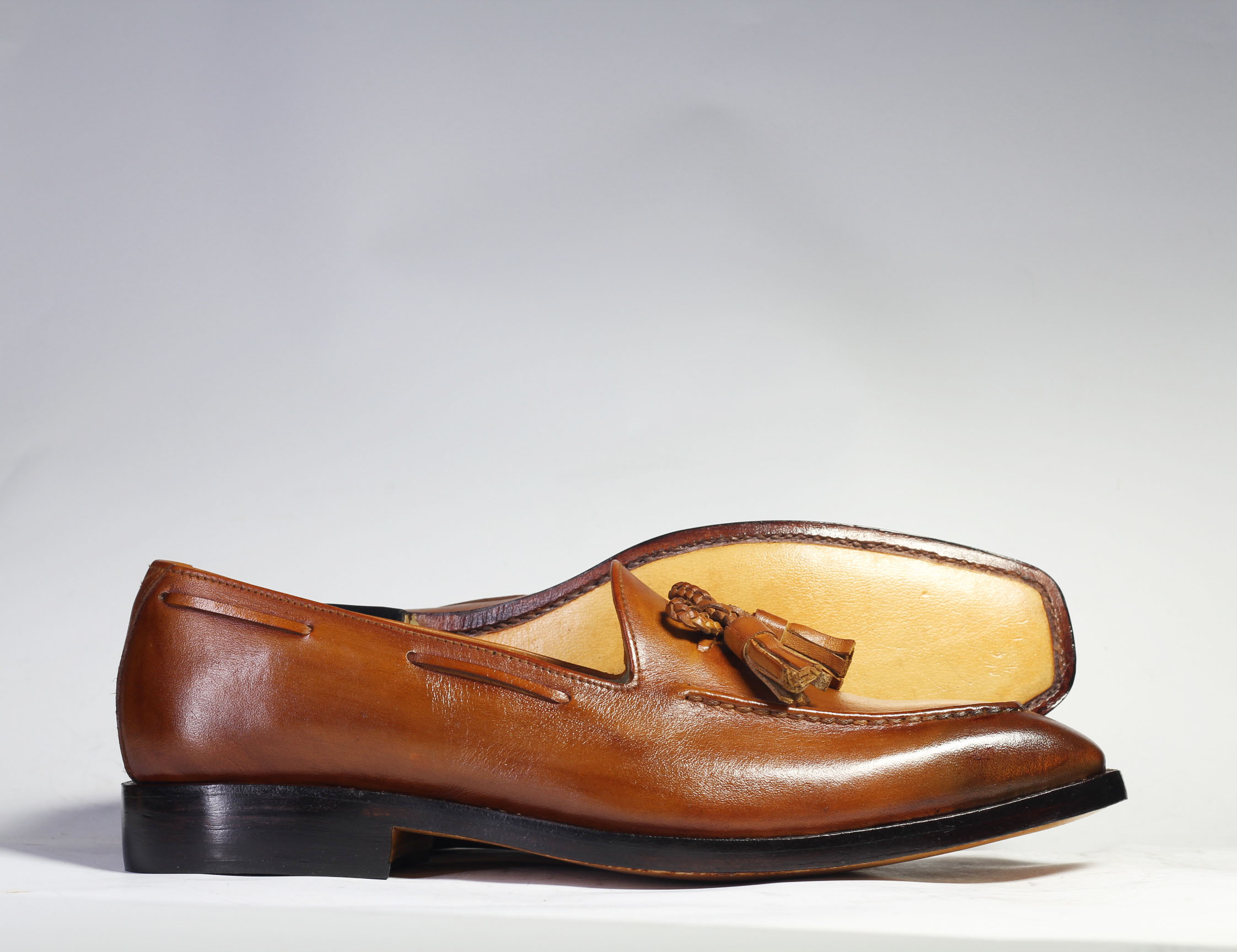 Handmade Brown Tussles Round Toe Leather Shoes For Men's