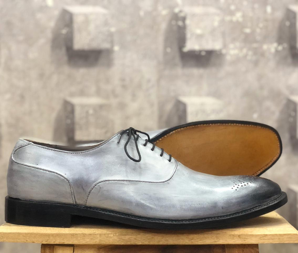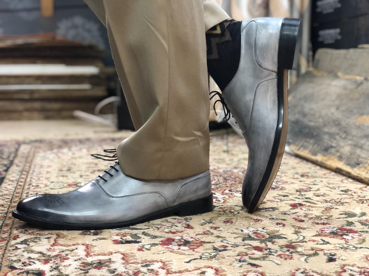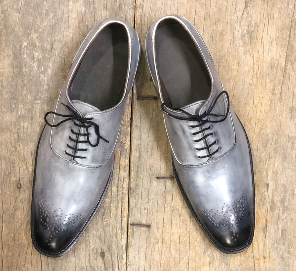 Handmade Men's Gray & Black Brogue Toe Leather Lace Up Shoes