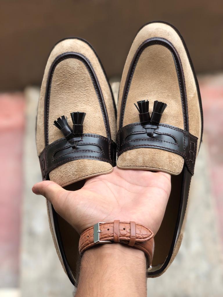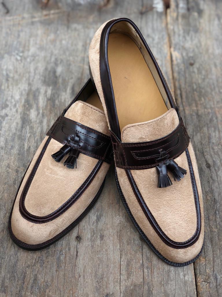 Men's Handmade Black & Beige Tussles Round Toe Leather Suede Loafers