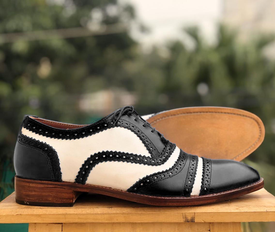 Handmade Black & White Leather Stylish Cap Toe Lace Up Shoes For Men's