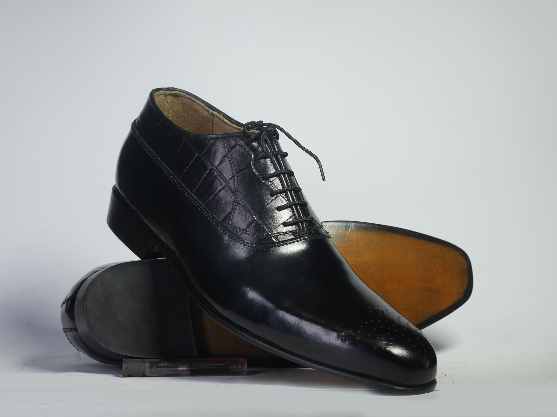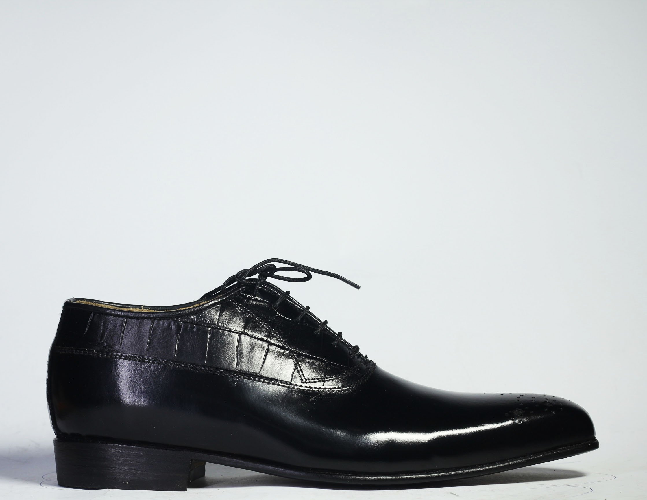 Handmade Men's Black Leather Alligator Texture Brogue Toe Dress Leather Shoes