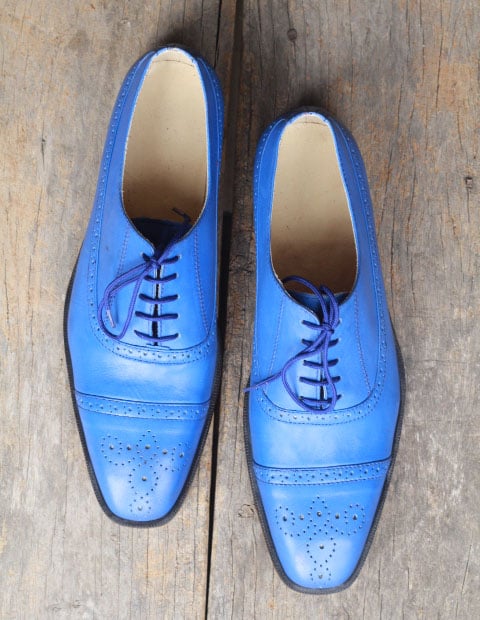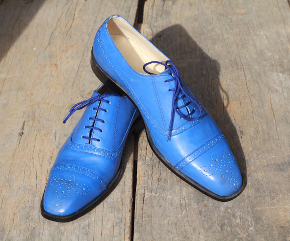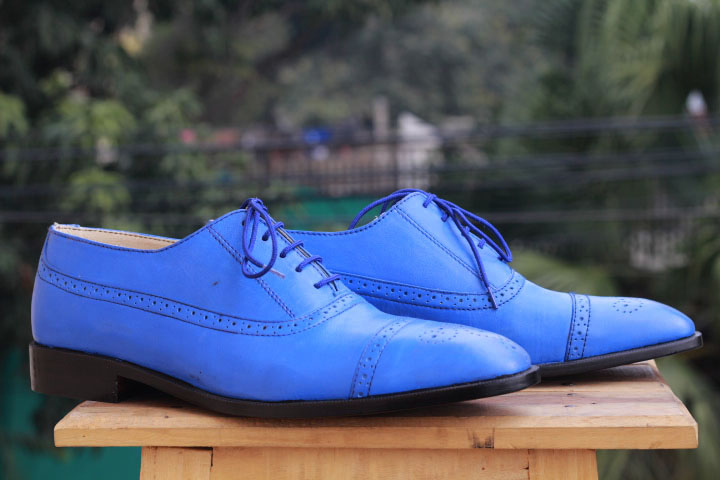 Handmade Men's Blue Color Leather Cap Toe Brogue Dress Lace Up Shoes
