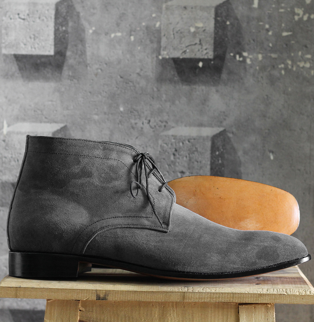 Handmade Men's Grey Color Round Toe Suede Lace Up Boots