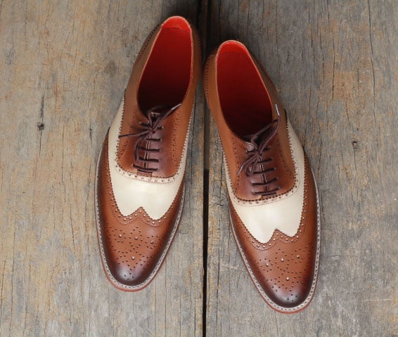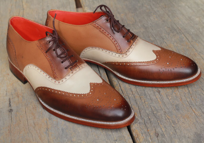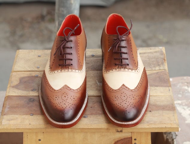 Handmade White & Brown Leather Stylish Wing Tip Brogue Lace Up Shoes For Men's