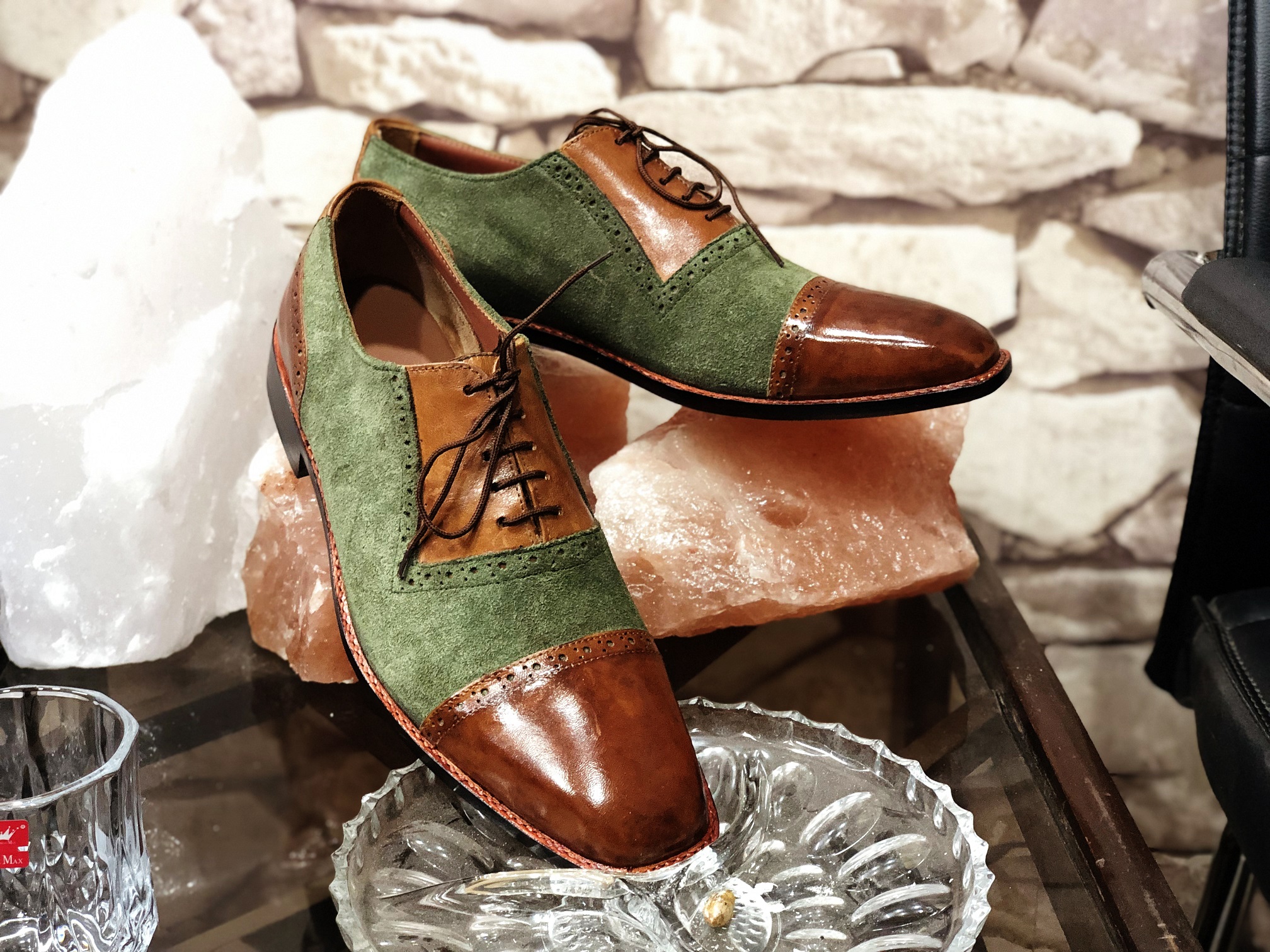 Handmade Tan & Green Leather Suede Stylish Cap Toe Lace Up Shoes For Men's