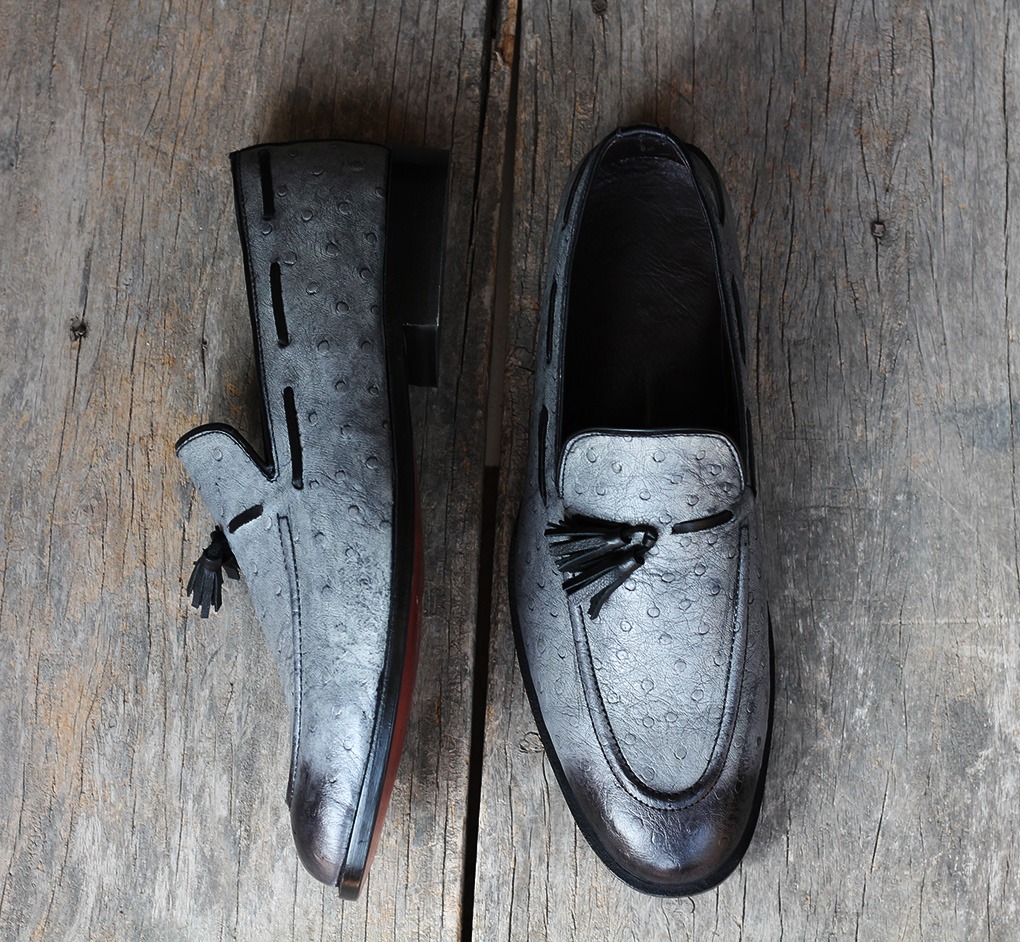 Handmade Men's Black & Gray Color Leather Round Toe Tussle Loafers