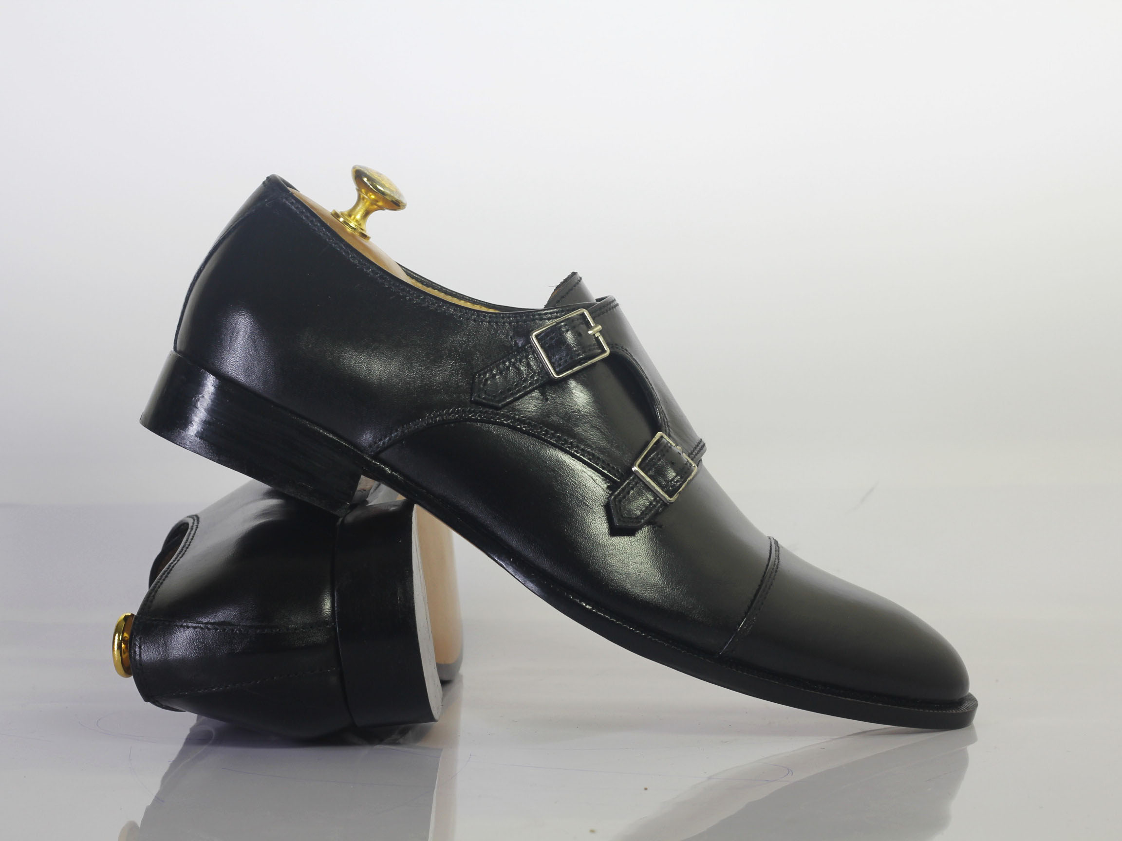 Handmade Men’s Black Color Leather Double Monk Buckle Dress Shoes