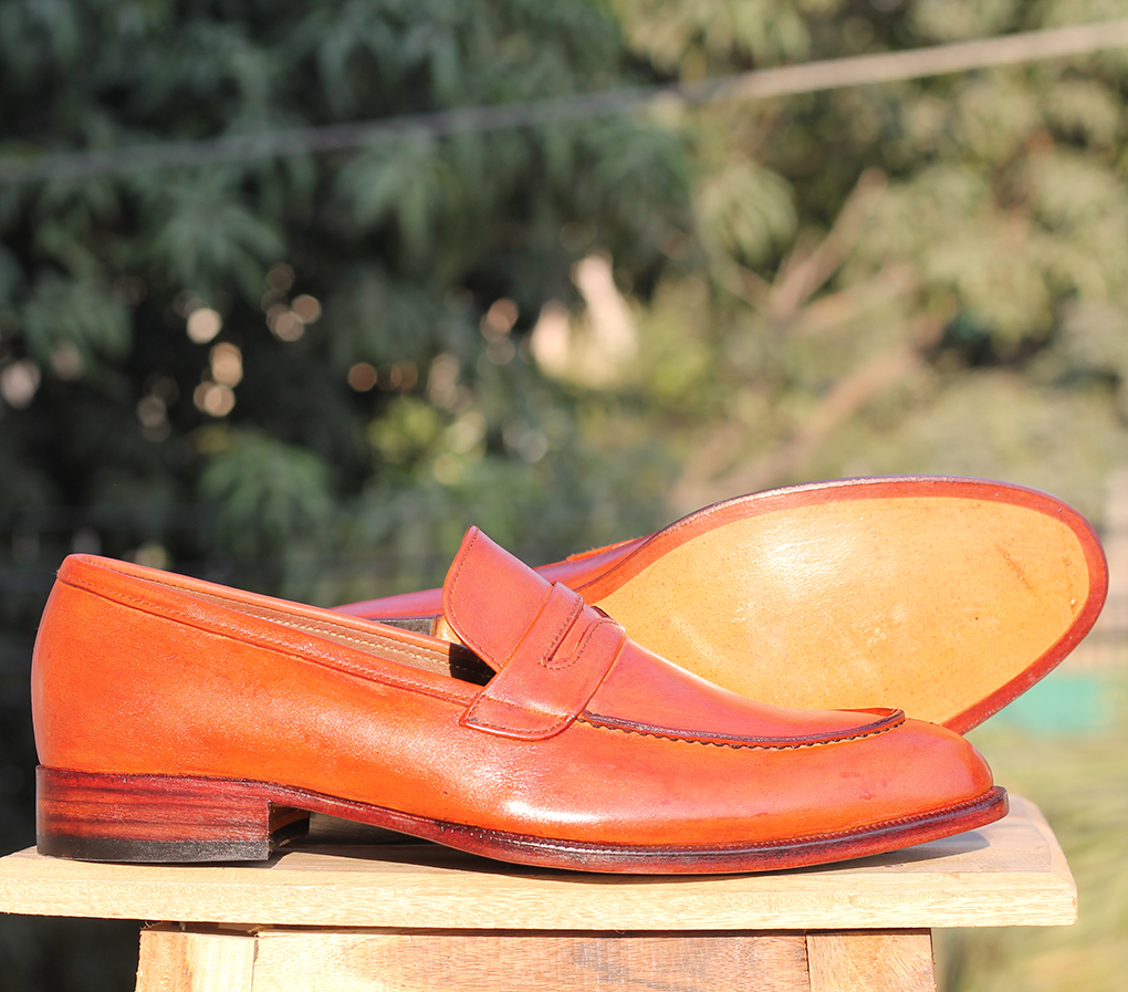 Handmade Men's Orange Color Leather Split Toe Tussles Loafers