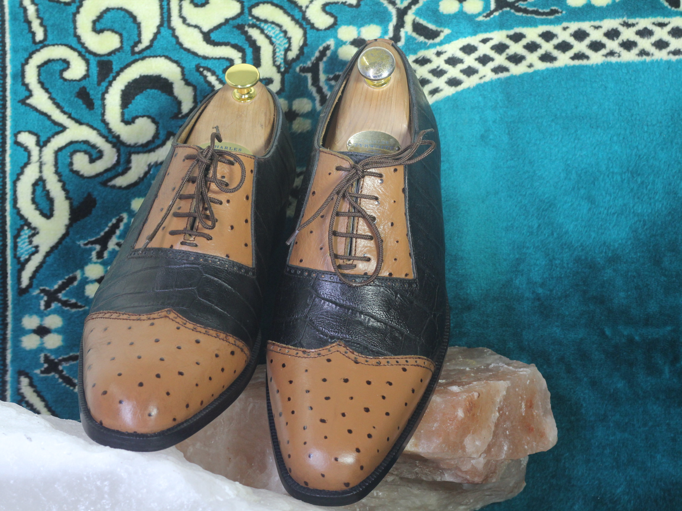 Handmade Men's Black & Brown Wing Tip Alligator Leather Lace Up Shoes