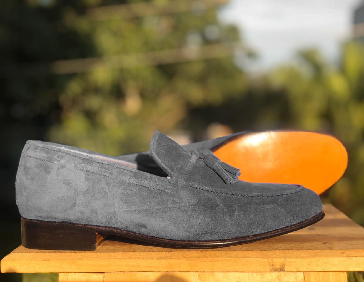 Handmade Men's Gray Color Suede Round Toe Tussle Loafers