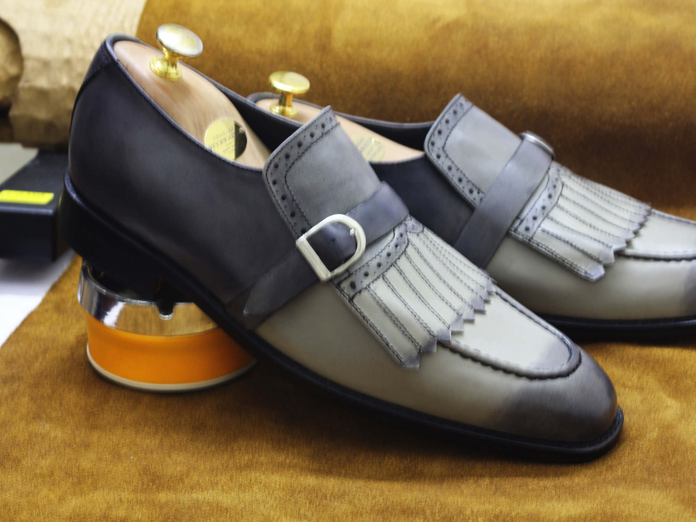 Handmade Men's Grey Color Leather Single Monk Strap Fringe Dress Formal Shoes