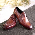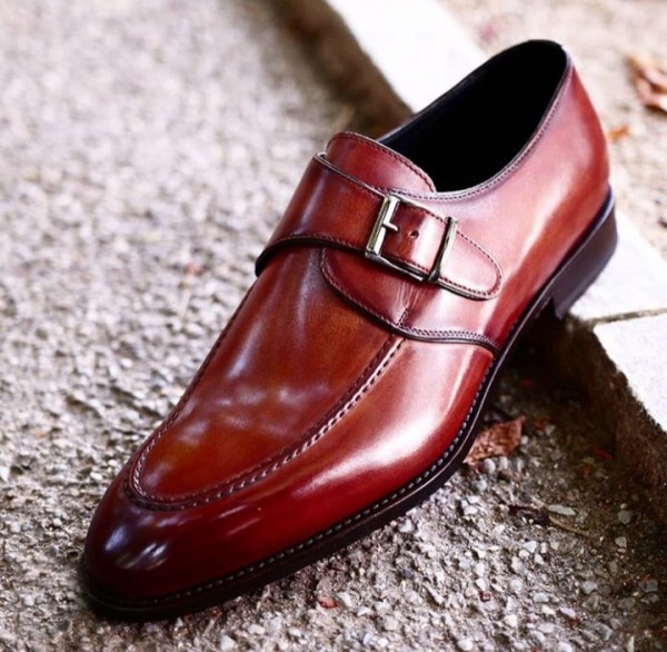 Handmade Men's Burgundy Color Leather Single Monk Strap Round Toe Dress Shoes