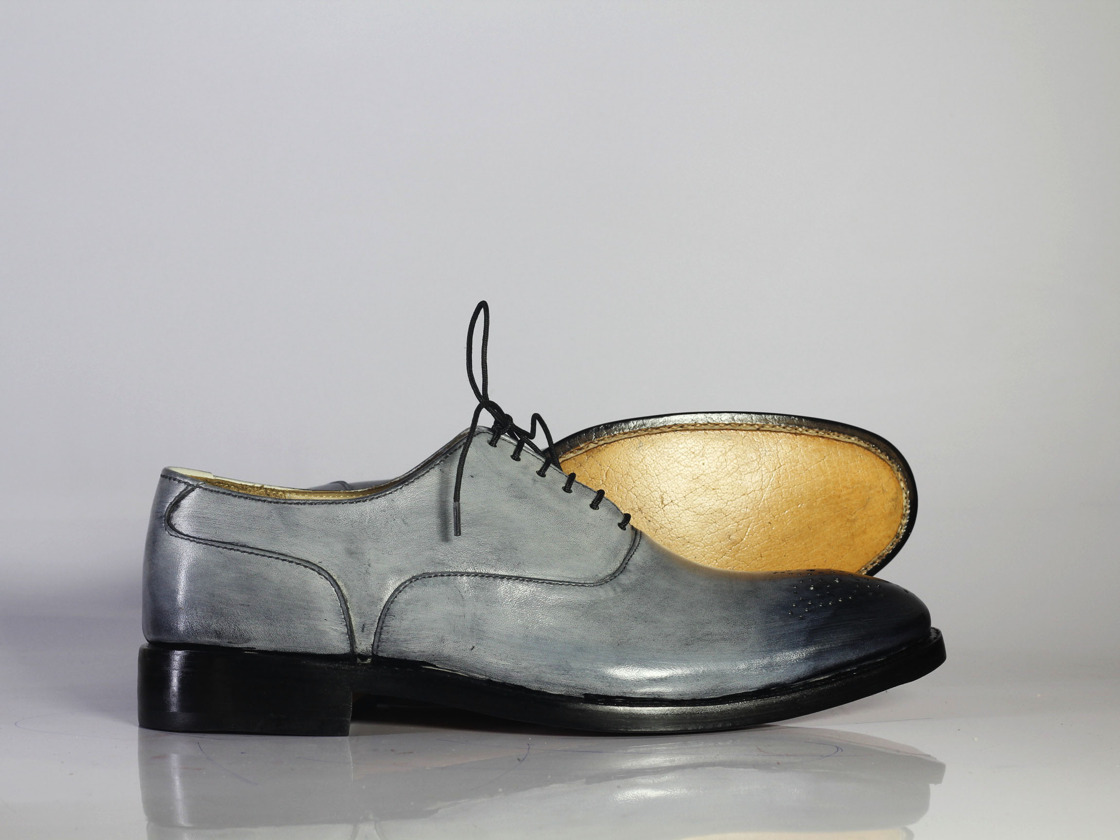 Handmade Men's Gray & Black Brogue Toe Leather Lace Up Shoes
