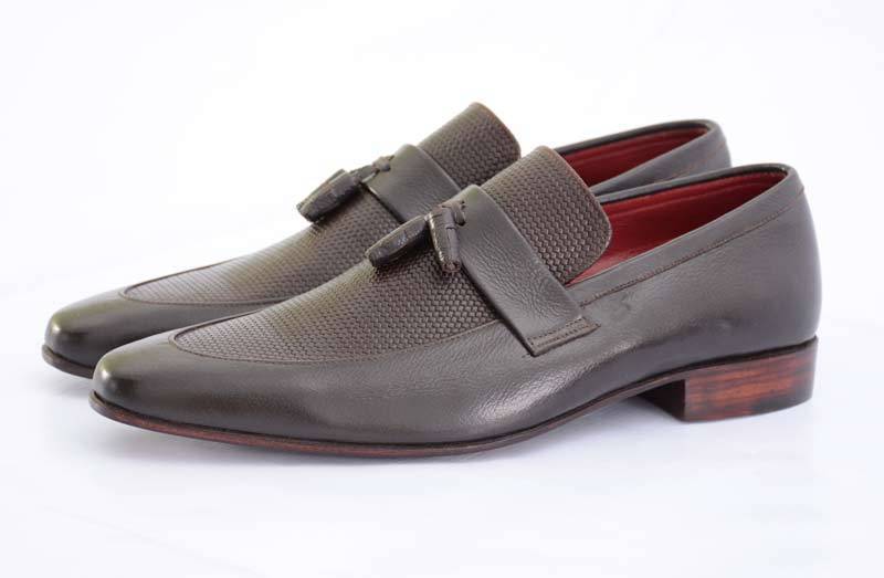 Handmade Men's Gray Color Pebbled Leather Round Toe Tussle Loafers
