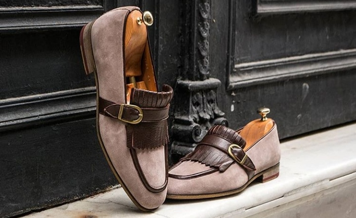 Handmade Brown & Beige Leather Suede Double Monk strap Stylish Loafer For Men's