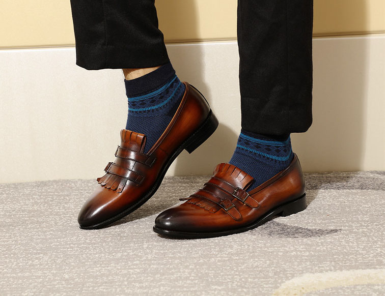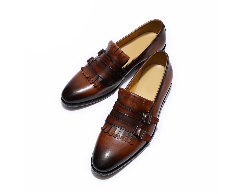 Handmade Brown Color Leather Fringe Double Monk Strap Loafer For Men's