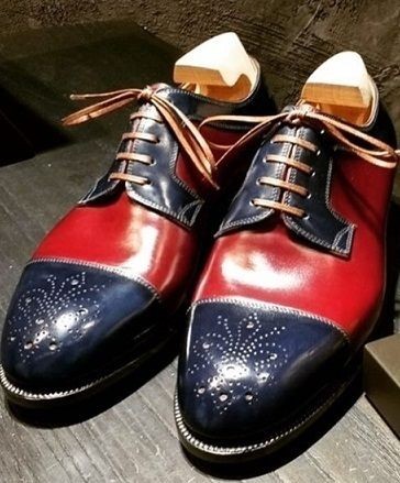 Handmade Navy Blue & Red Leather Cap Toe Brogue Lace Up Shoes For Men's