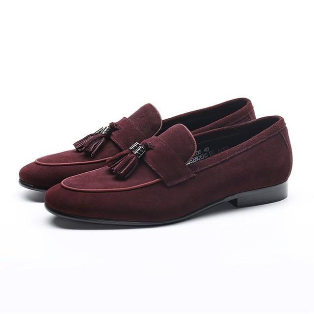 Handmade Burgundy Suede Tussles Loafer Shoes For Men's