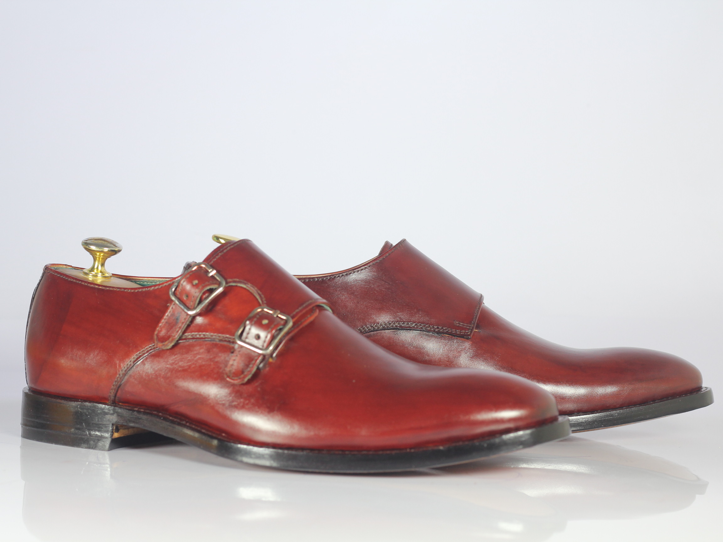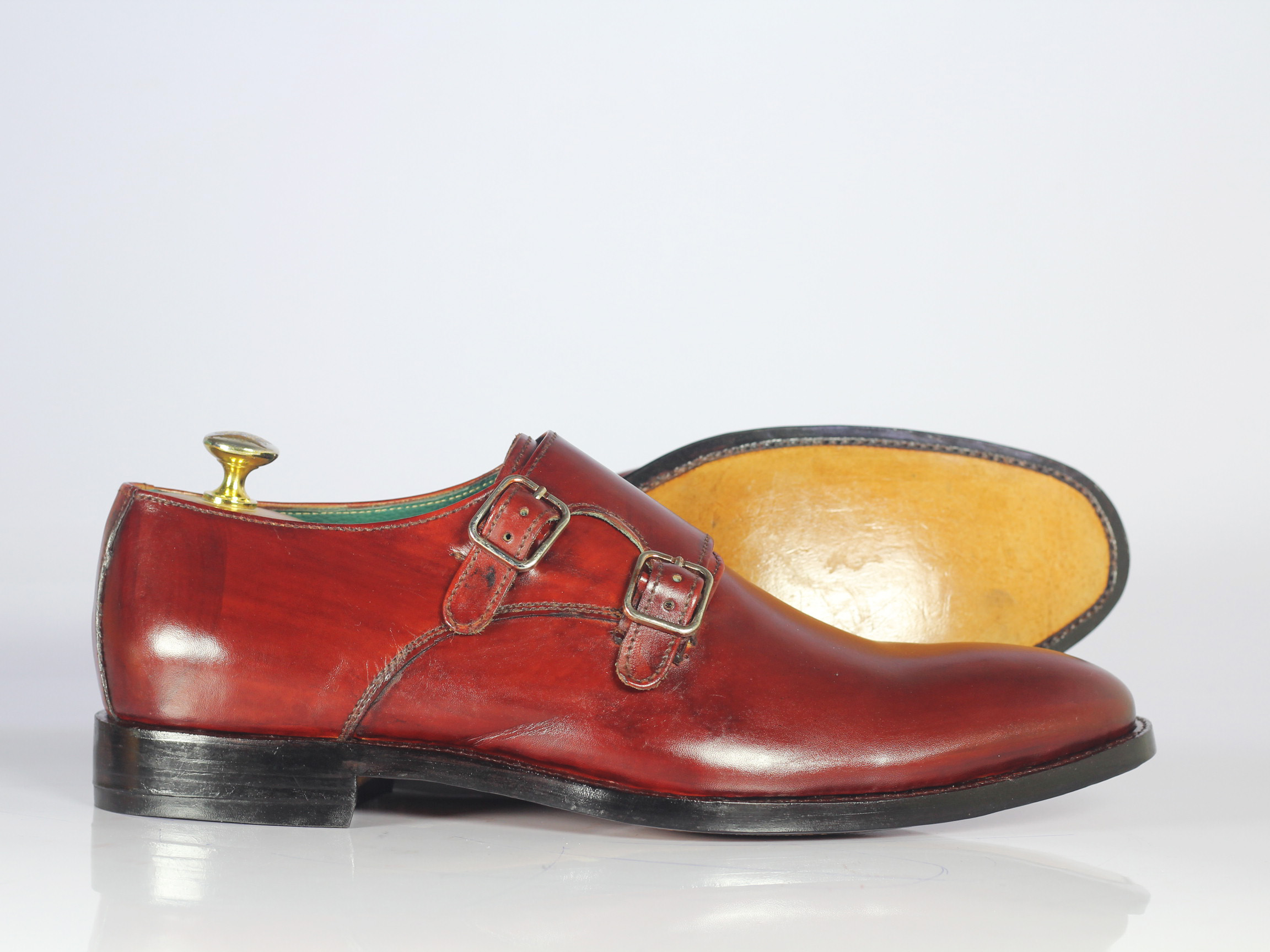 Handmade Red Leather Double Monk Strap Shoes For Men's