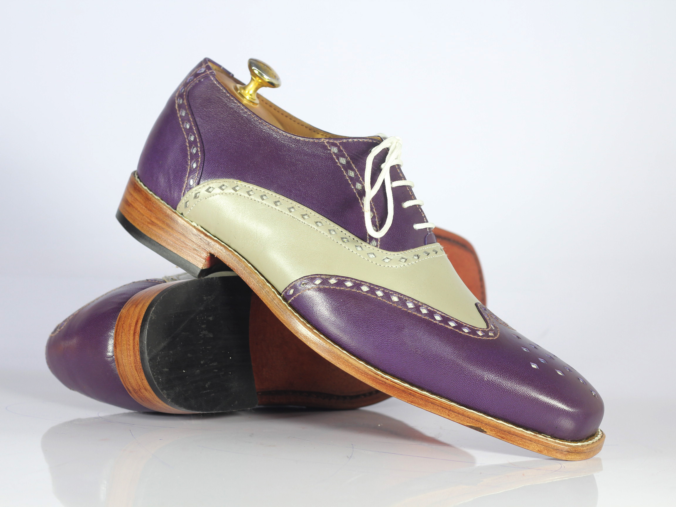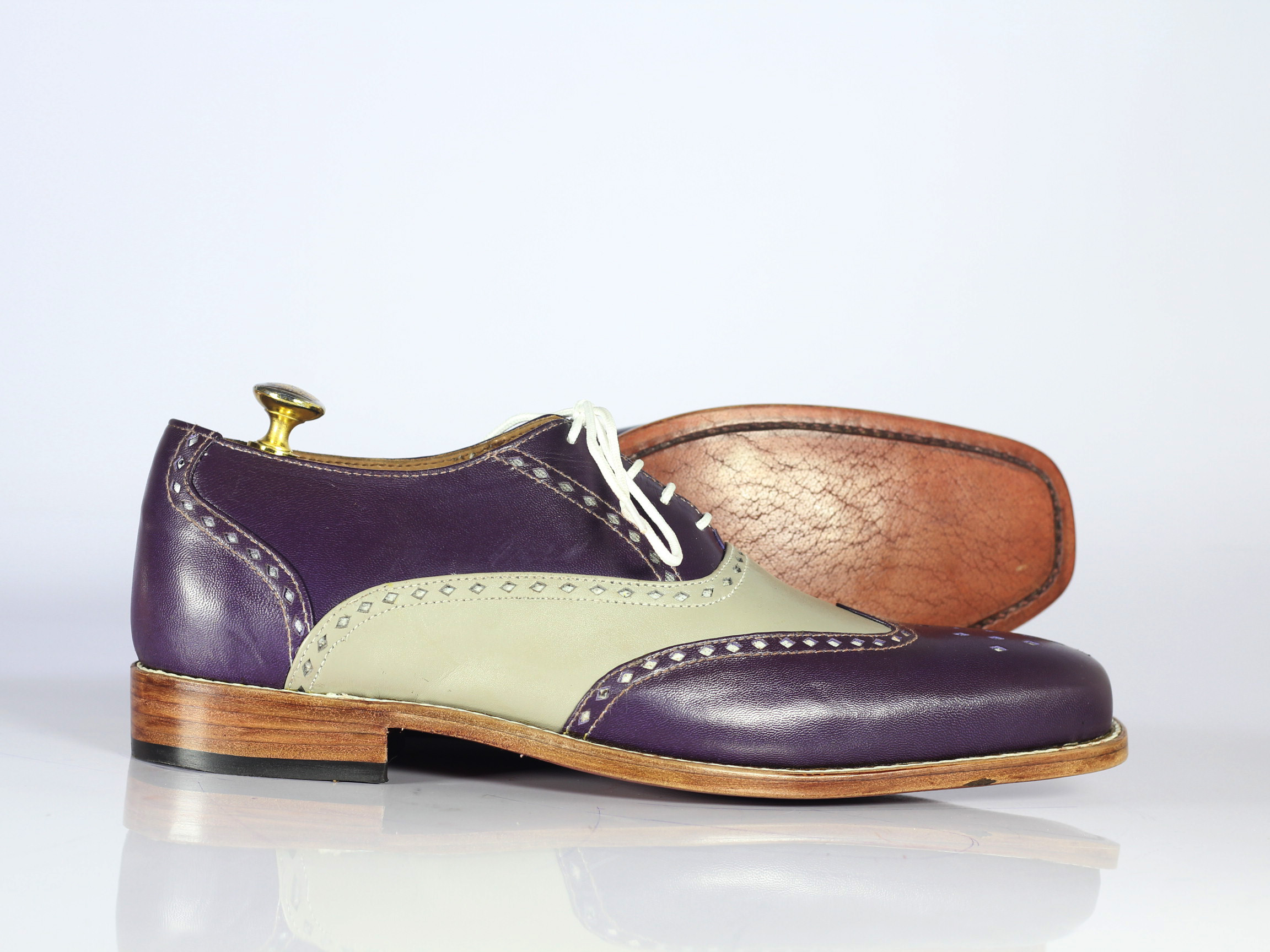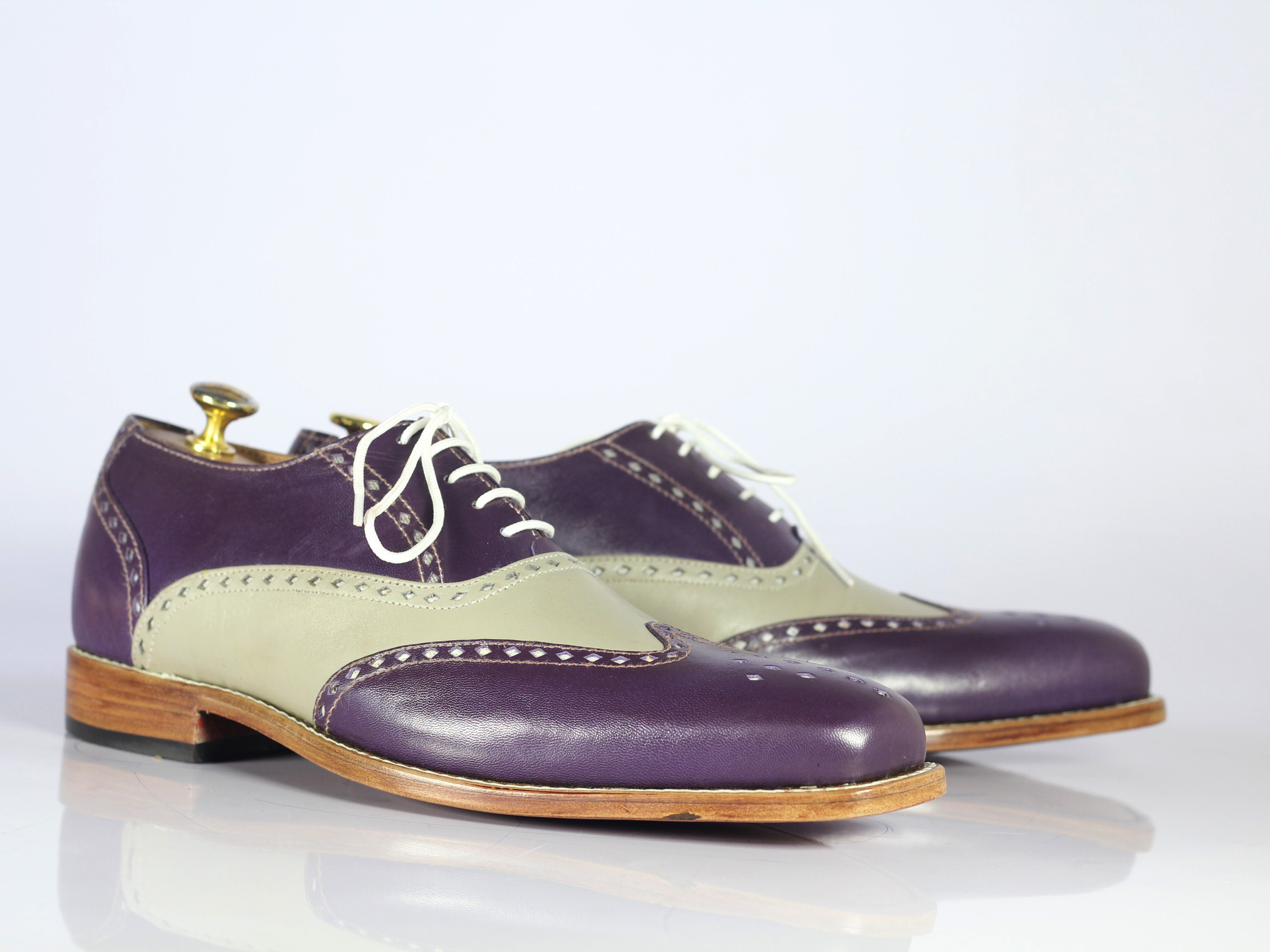 Handmade Purple & Gray Leather Wing Tip Shoes For Men's