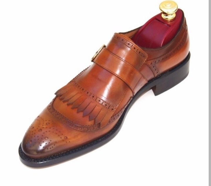 Handmade Brown Leather Fringe Brogue Toe Monk Strap Shoes For Men's