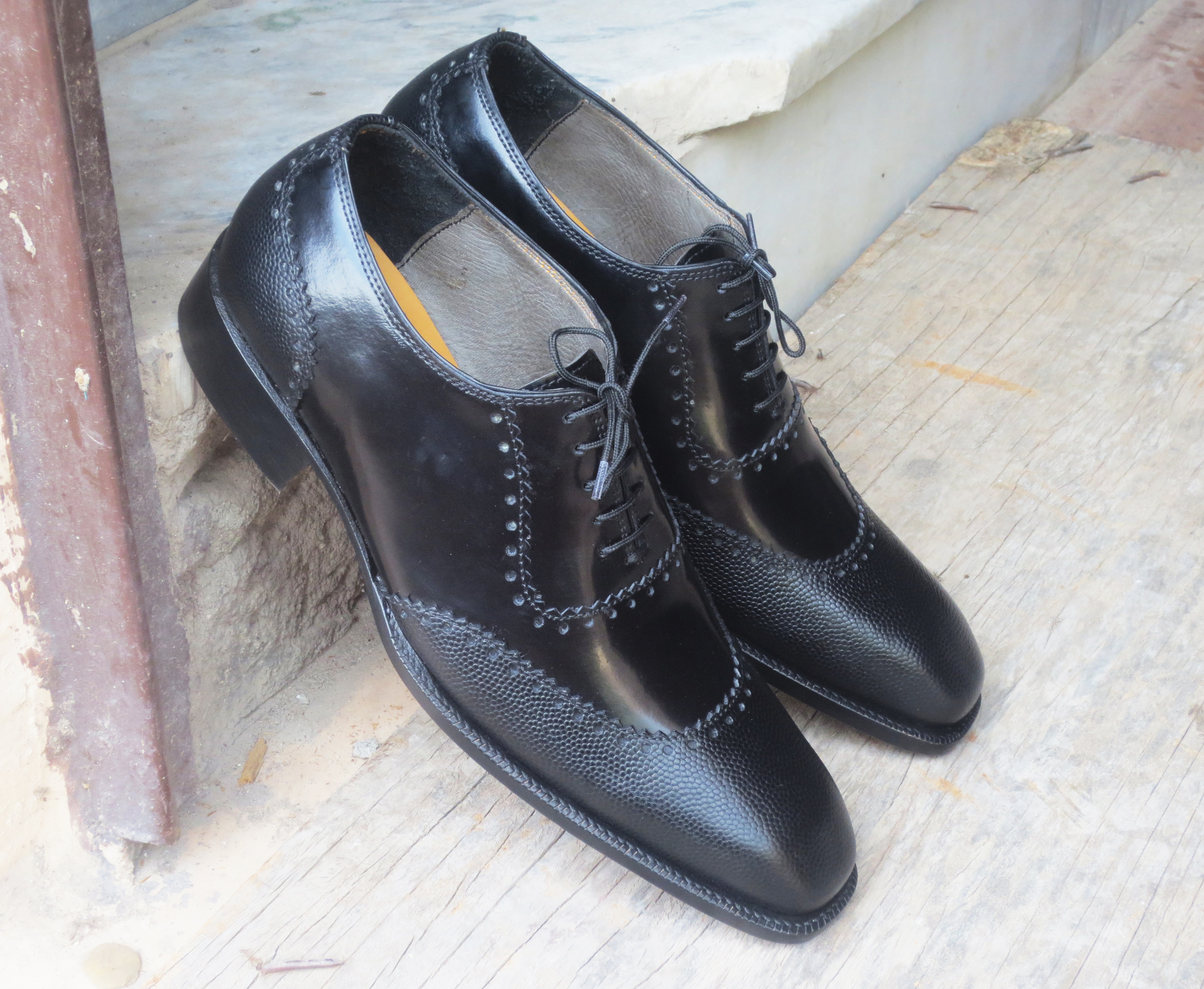 Handmade Black Pebbled Leather Round Toe Lace Up Shoes For Men's