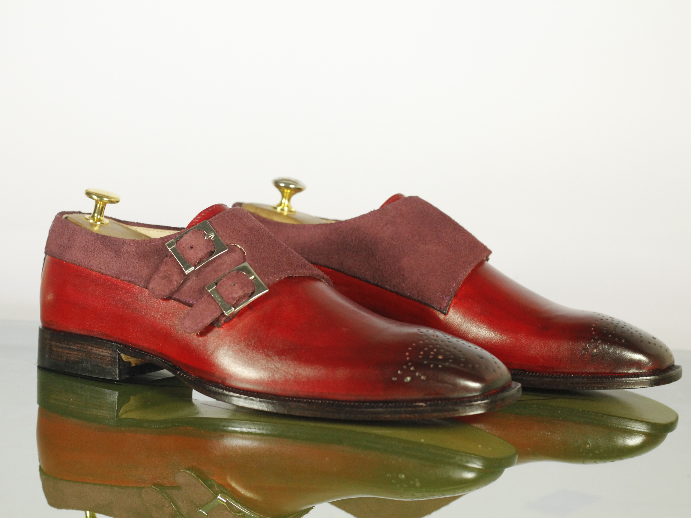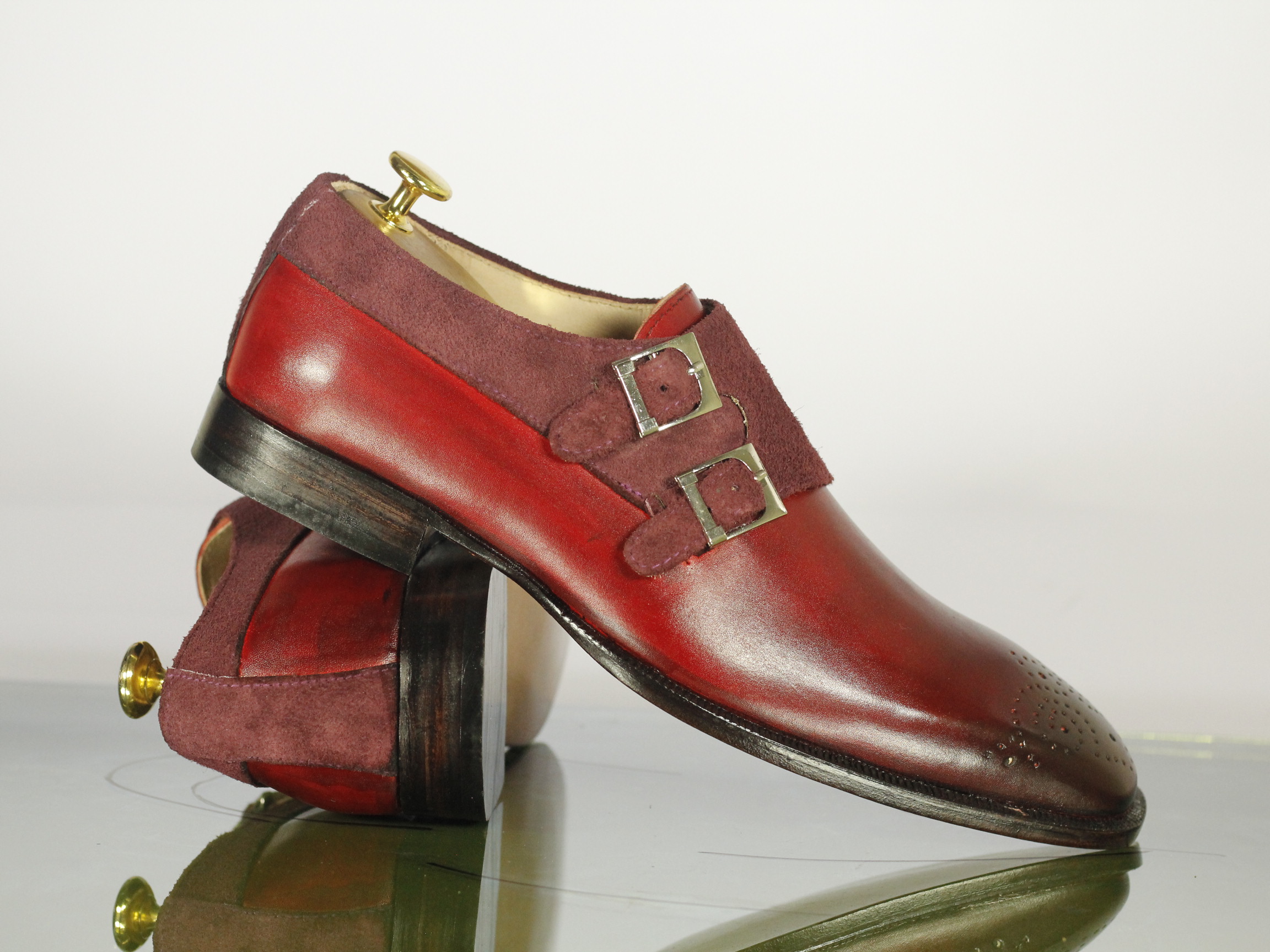Handmade Men's Burgundy Color Double Monk Suede & Leather Brogue Toe Dress Shoes