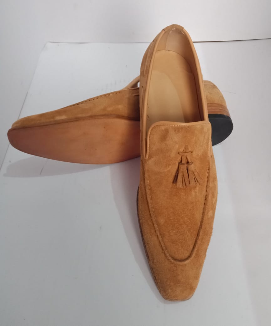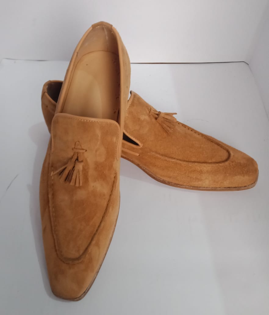 Handmade Men's Tan Color Suede Round Toe Tussle Dress Loafers Shoes