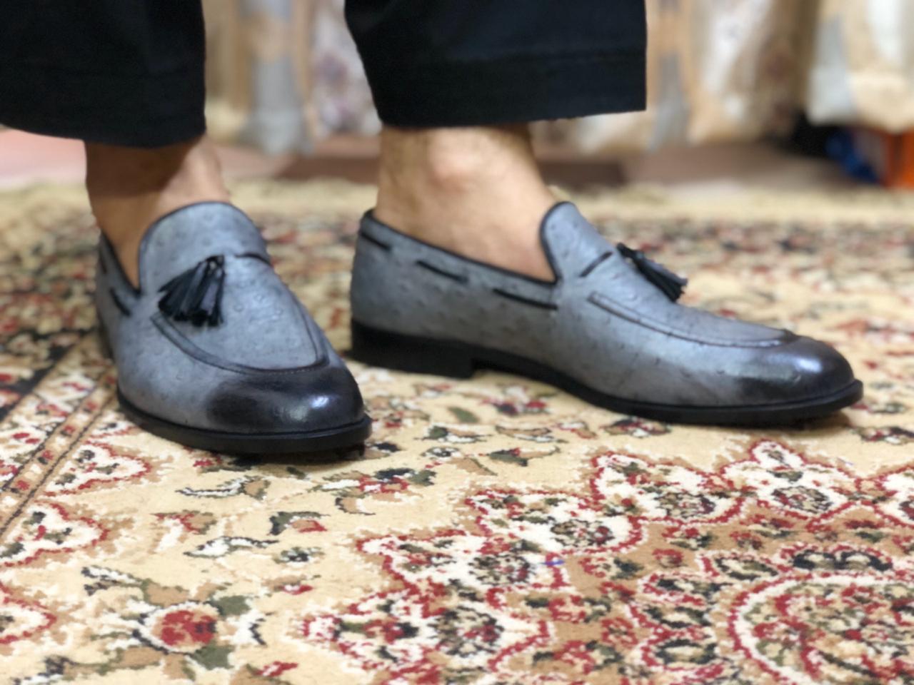 New Handmade Bespoke Gray Black Ostrich Leather Slip On Tussles Loafers Moccasin Shoes, Elegant Dress Leather Shoes
