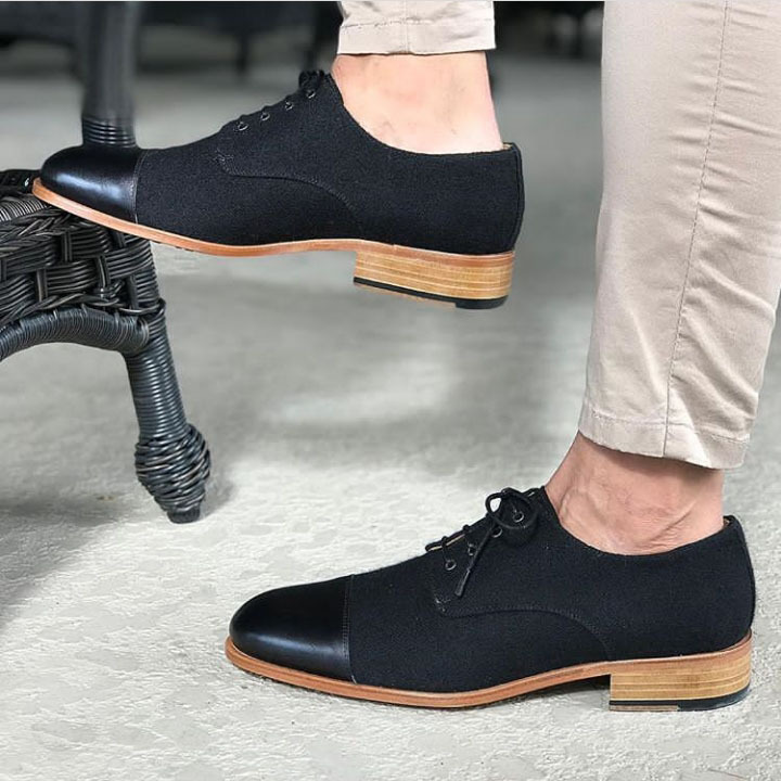 Bespoke Handmade Black Leather & Fabric Derby Shoes, Elegant Cap Toe Formal Lace Up Shoes