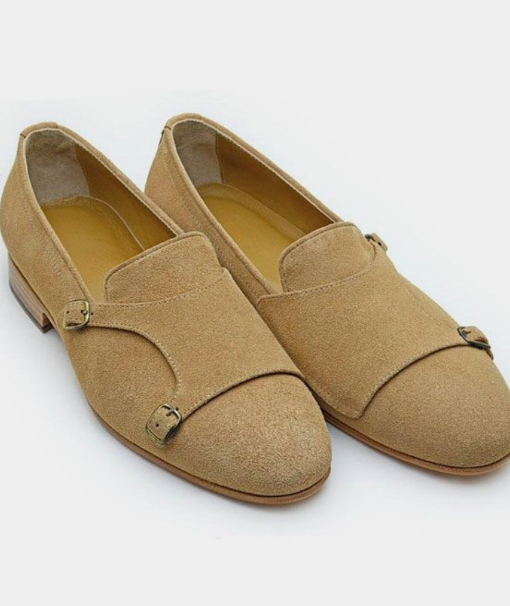 Men Beige Double Monk Suede Formal Shoes, Customized Bespoke Dress Shoes