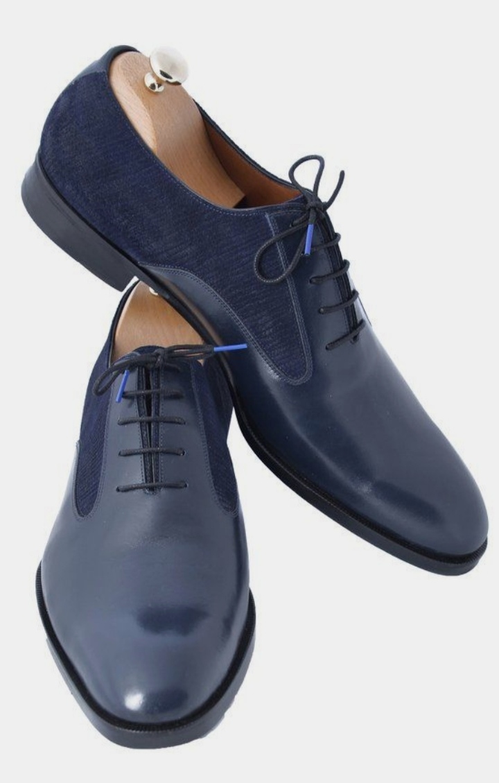 Unique Blue Formal Lace Up Leather Tweed Shoes, New Bespoke Leather Shoes