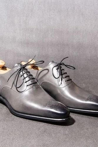 Men Gray Brogue Narrow Toe Leather Formal Shoes, New Bespoke Leather Shoes