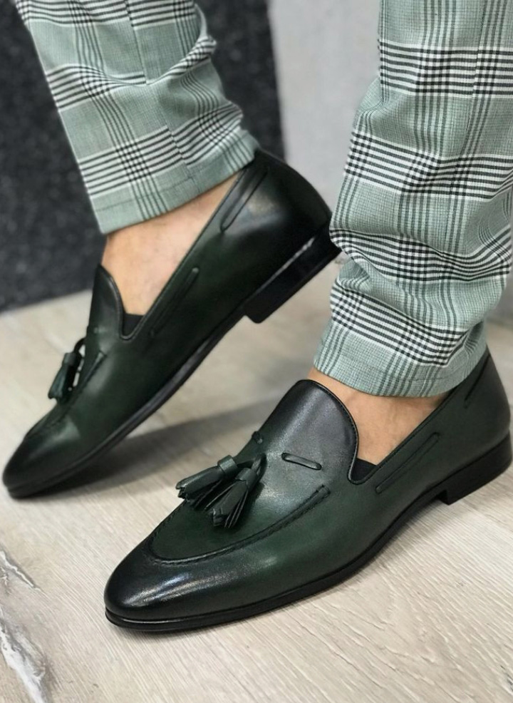 Elegant Green Black Tassels Loafer Slips On Moccasin Formal Shoes, Handmade Dress Formal Leather Shoes